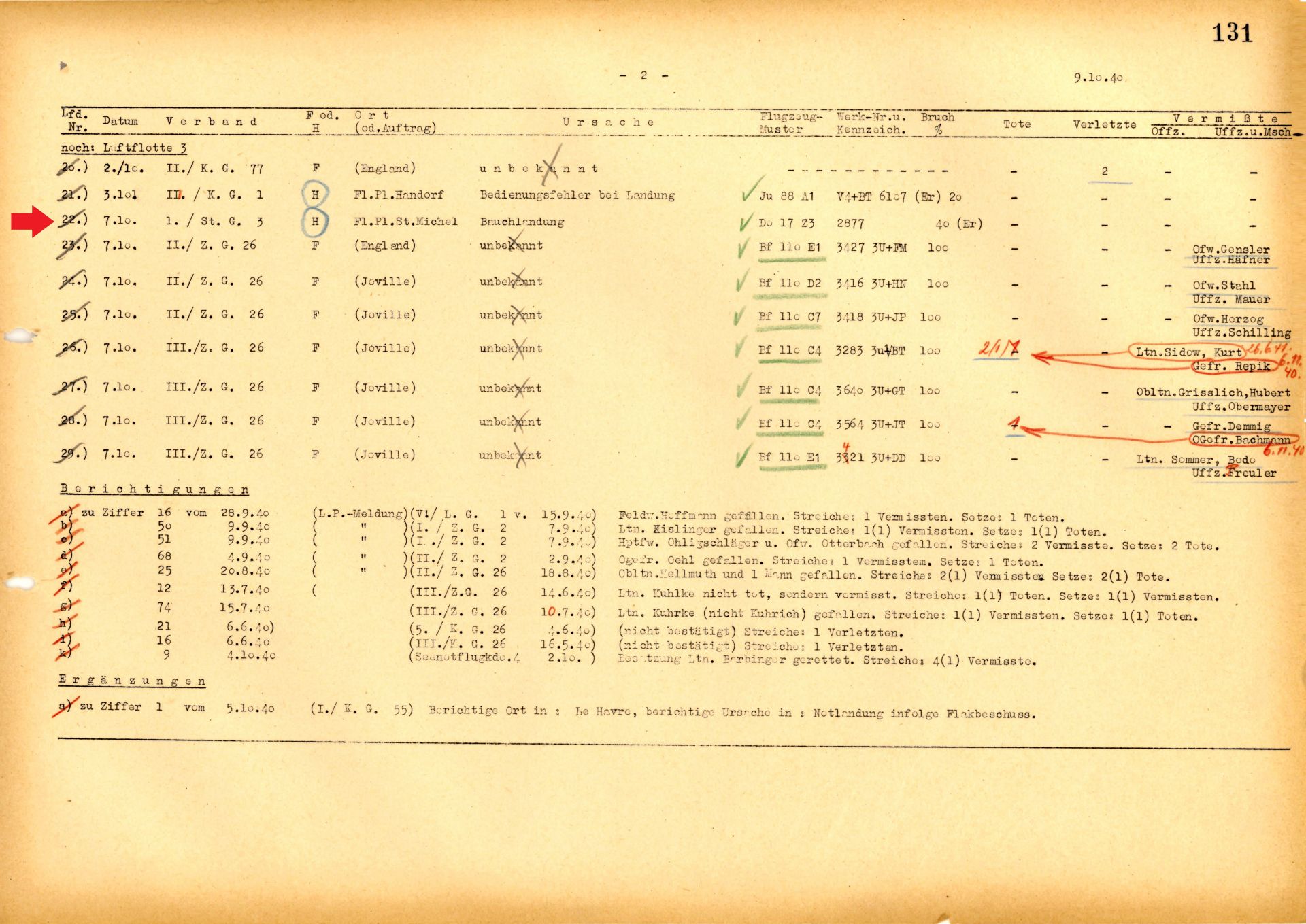♦ Document d'archives recensant les pertes de la Luftwaffe : on y voit en date du 4 octobre 1940 (flèche rouge) l'atterrissage d'urgence ("Bruchlandung") Du Dornier Do 17 Z à Dinard avec un taux de dommage à 40%.