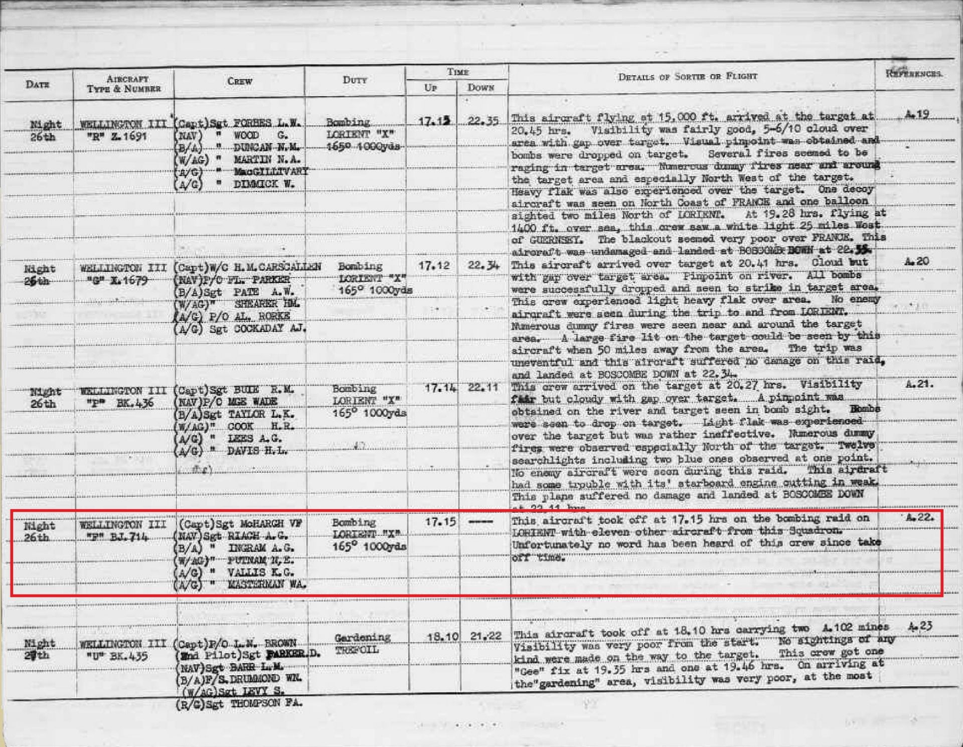 Aux commandes de cet appareil, le sergent McHarg Vernon Frédéric, avec à sa droite le navigateur le sergent Riach Allan Cruickshank. L’opérateur radio, qui est aussi, le premier mitrailleur est le sergent Putnam Max Ernest avec pour second mitrailleur le sergent Masterman Wallace Alfred. Le troisième mitrailleur est le sergent Ken Vallis. Le sergent opérateur chargé de larguer les bombes sur l’objectif est le sergent Ingram Graydon Arthur. Tous sont âgés d’une vingtaine d’années. Le groupe a décollé du nord-est de l'Angleterre vers 17 heures 30 et rejoint la formation à 18 h. A l’aller, le vol se passe sans aucun problème. Arrivé à la verticale de la base de Lorient, le largage est effectué par le sergent Ingram mais une bombe refuse de s’éjecter de la soute suite à un problème technique.
