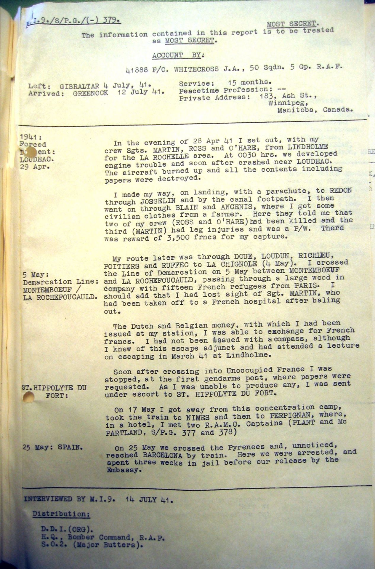 The pilot Flying Officer Whitecross had landed without any problem in the countryside around. After he had hidden his parachute in the vegetation, he remained hidden the rest of the night, and probably looked at his bomber in fire. He was not catched despite the important investigations launched to find him in the region of Loudéac, region that he rapidly left. After a one week long wandering through Redon then Josselin, he was helped by some people in Blain and Ancenis, and left then Brittany and welcomed by a resistance network which led him towards Doué, Loudun, Poitiers, Ruffiec and La Chignolle where arrived on May 4th, 1941. Then he was led southward to cross the demarcation line, that he crossed between Montenboeuf and La Rochefoucault (Charente) on May 5th, 1941 to reach Spain. A few days later, he was arrested because he could not present his papers, and was escorted by two gendarmes to the camp of Saint Hippolyte du Fort in the department of the Gard, from where he escaped on May 17th, 1941. After he crossed the Spanish border by train on May 25th, 1941 through Nîmes and Perpignan together with captains Plant and Mac Partland, they were all three arrested again and imprisoned a couple of weeks in the region of Barcelona, and then released after the intervention of the ambassador of England. They then reached Gibraltar. They left this small English territory, located in the extreme southern tip of the Iberian Peninsula, on July 4th to reach England by air and arrived all three on July 12th at Greenock (Scotland). After a short stay in the intelligence services, the Flying Officer Whitecross answered the questions of his superiors after this accident, then reached a new unit around July 10th, where he was informed that he would have to return in Canada next September which was obviously for him a good news.