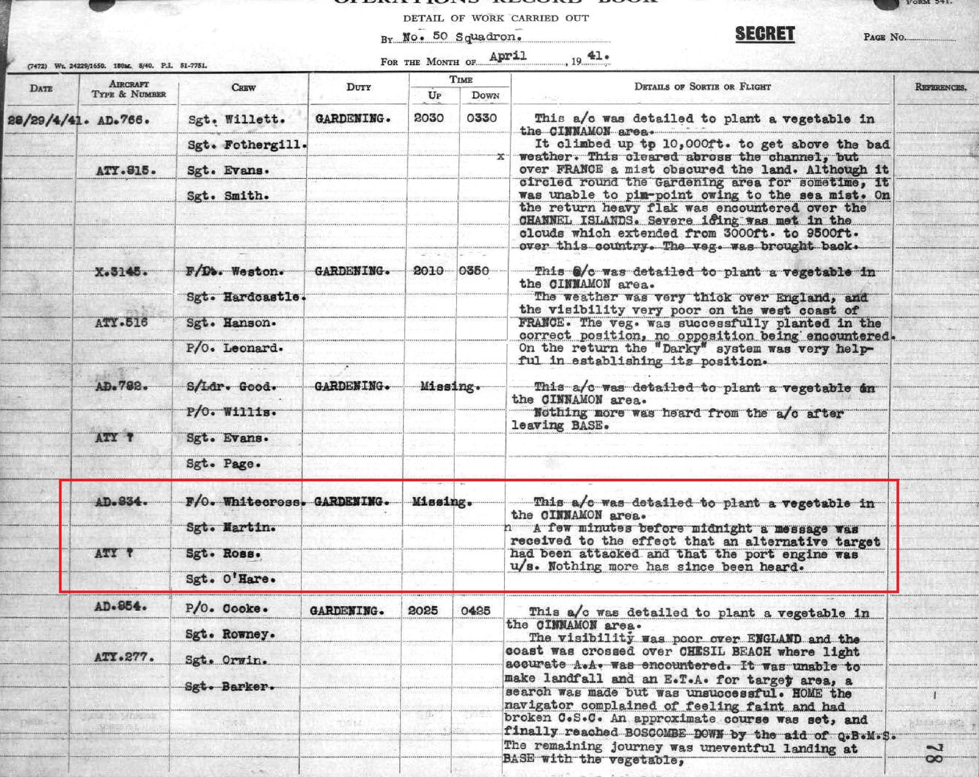 The pilot Flying Officer Whitecross was declared officially dead on May 28th, 1942. His name, as well as the names of his 3 companions, were registered on the monument of missing persons of RUYNEMEDE in London. (Panel N 30).