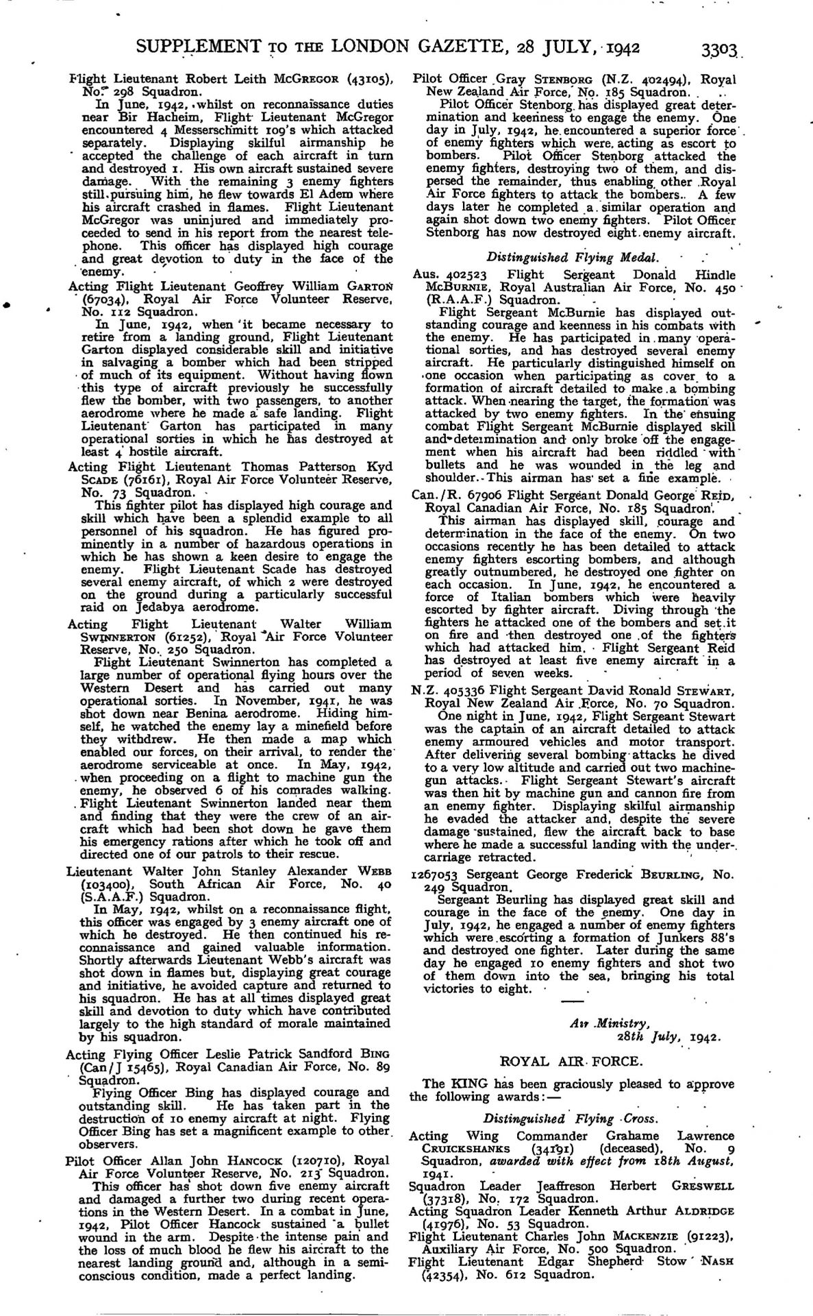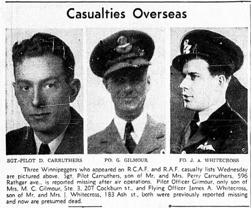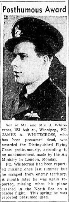 In Canada on April 20th, 1943, the 6 Squadron of the Air Cadet, commanded by General Wolff took officially the name of "Jim Whitecross" and the mother of the Flying Officer attended this ceremony. The Flying Officer Whitecross was decorated posthumously with the British distinction DFC. Distinguished Flying Cross.