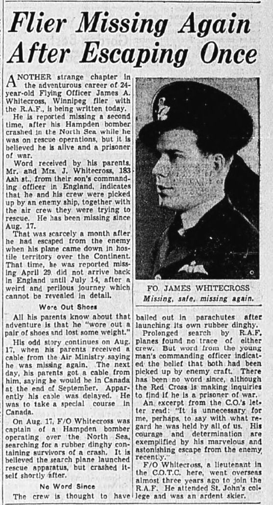 "Jim", a nickname he was given by his friends, was one of Mr. and Mrs Whitecross' numerous sons. He lived 183 Ash street in Winnipeg. He was born on March 3rd, 1917 in the same city. He studied in Saint John high school. Afterward he integrated the Manitoba university to pursue studies in civil engineering. He spent his free time to ride his motorcycle, his great passion. Late 1939, he felt that the world was not going well and decided to reach England and join the Royal Air Force. That's what he did in January, 1939. On Tuesday, July 15th, 1941, at Swinderby Air Force base, in Lincolnshire, a bomber did not return from a mission over Norway. It sent a distress message. Another aircraft from the same mission indicated that a crew was drifting in the North Sea aboard a lifeboat. A volunteer was required to look for this crew in distress and to drop them foods before trying to rescue them. Freshly assigned in this unit, the Flying Officer Whitecross immediately volunteered. He had with him aboard his Hampden registered P4408 Sergeant Fisher Mo, sergeant Gray dfm, and sergeant R.Taylor. He took off immediately to look for his companions. He found them and accomplished the mission. On the way back one of his engine had serious problems. He was once again in a situation unfortunately already known. He contacted his base by radio at 3:30 pm and indicated his concerns. They were never seen again. It was the 30th mission of this courageous airman.
