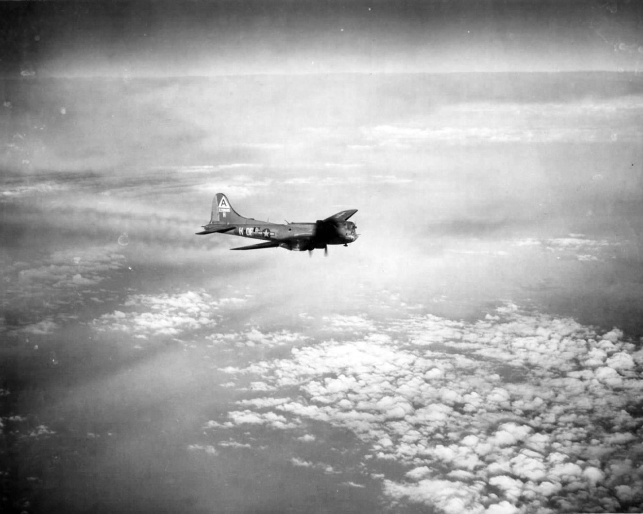 The B-17 "The Black Swan" (s/n 42-29895) in flight over Bremen, Germany, on December 20, 1943, 11 days before it was shot down.