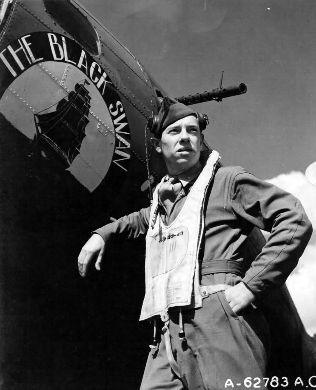 The "nose art" of the B-17 "The Black Swan" with Captain Parker, the pilot of the aircraft in August 1943, in the foreground.