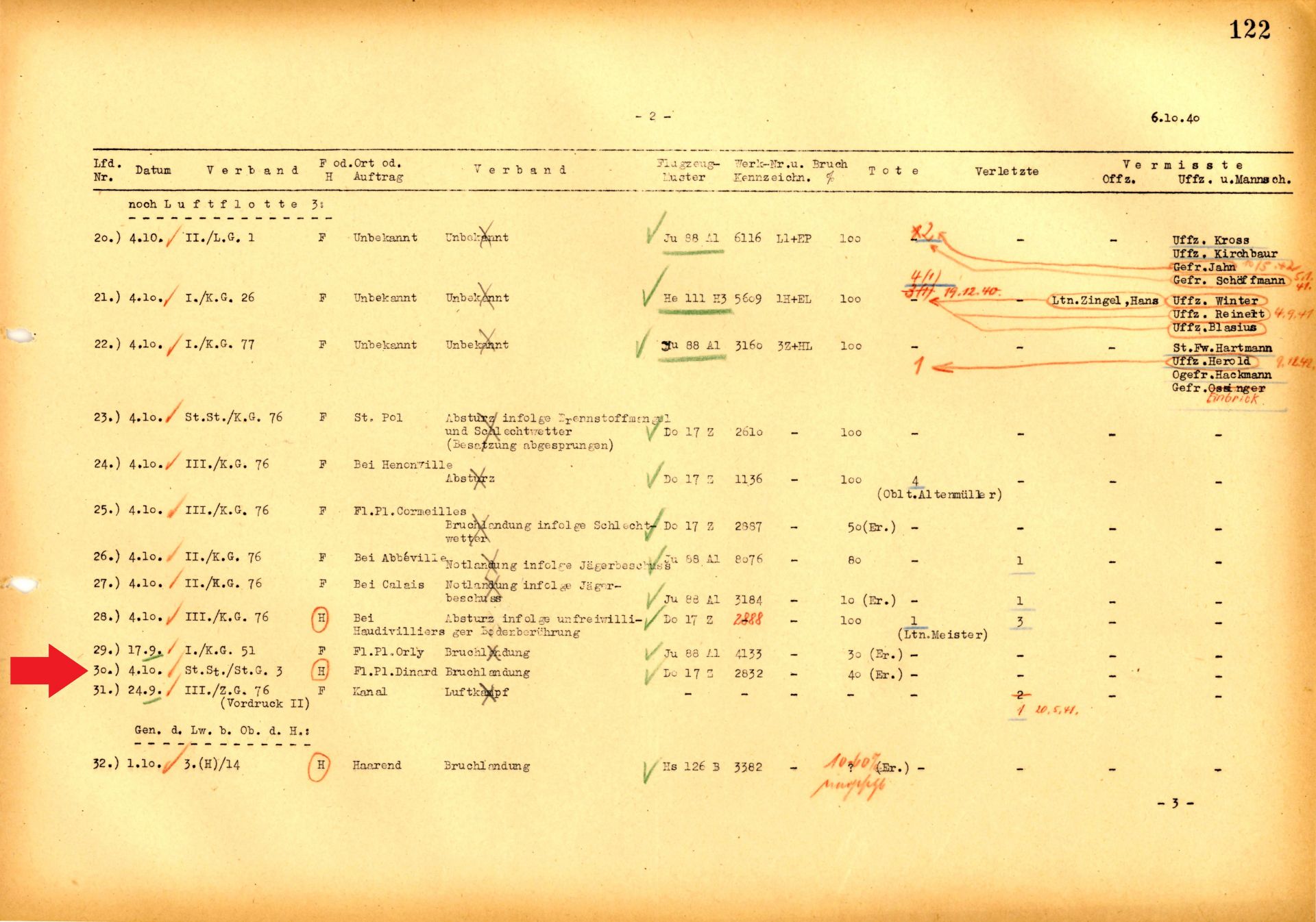 ♦ Archive document listing Luftwaffe losses : it shows, dated October 4, 1940 (red arrow), the emergency landing ("Bruchlandung") of the Dornier Do 17 Z at Dinard with a damage rate of 40%.