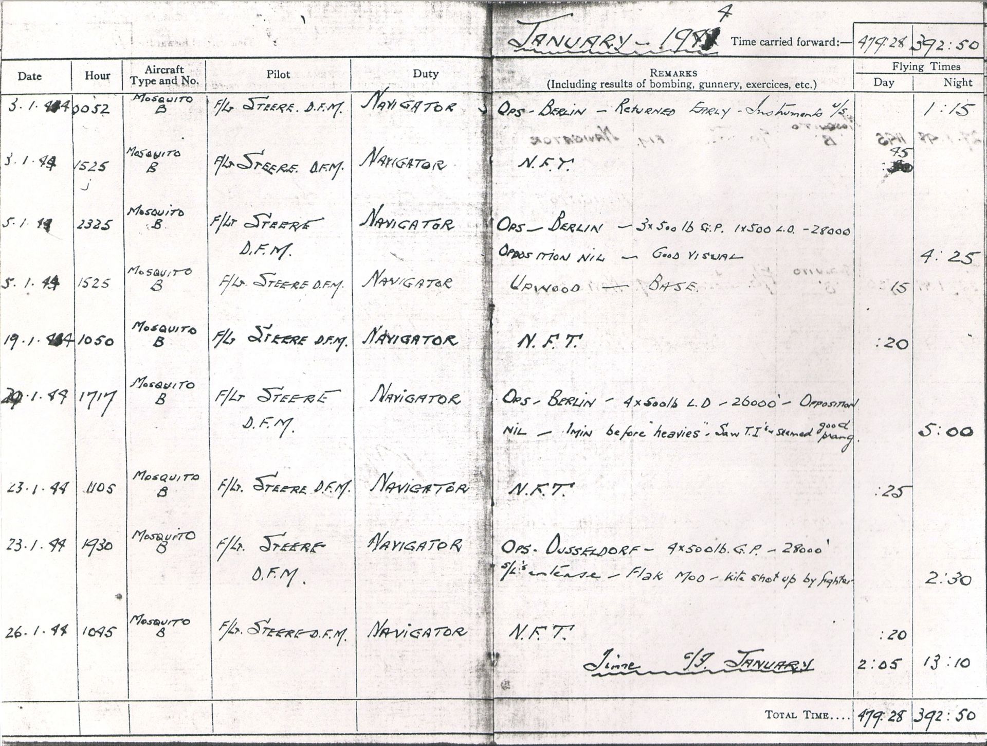 m) à partir du 14 septembre 1943, il rejoint le No. 1655 MTU à la base RAF Marham (Norfolk) et vole sur Airspeed Oxford puis, à partir du 29 septembre 1943, sur De Havilland Mosquito, date à laquelle il devient le navigateur du F/Lt Steere. Le MTU (Mosquito Training Unit) 1655 avait pour but de former des équipages à l'utilisation des systèmes de marquage de cible, comme le système OBOE. A partir du 16 octobre 1943, les missions opérationnelles reprennent pour notre tandem Steere/Gale au sein du No. 139 Squadron "Jamaica" : Dortmund (16/10/1943), Berlin (18/10/1943 et 20/10/1943), Cologne (24/10/1943 et 03/11/1943), Hanovre (05/11/1943 et 11/11/1943), de nouveau Berlin (13/11/1943)
