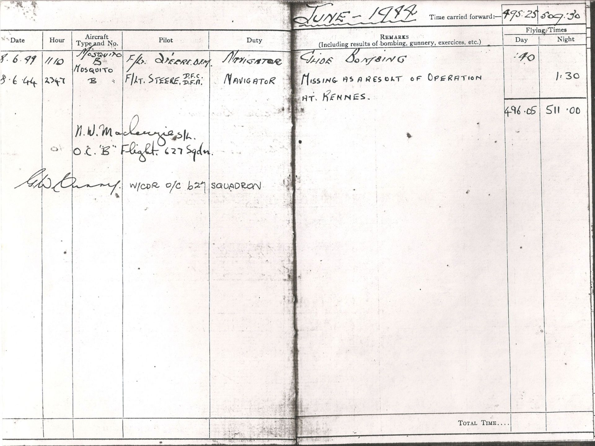 p) le 8 juin 1944, le Carnet de Vol indique un décollage à 23h47 pour une mission sur Rennes. Quelqu'un rajoutera sur le carnet que l'équipage fut proté manquant. Kenneth Willialm Gale avait accumulé 1007 heures et 5 minutes de vol, dont 496 heures et 5 minutes de jour et 511 heures de nuit !