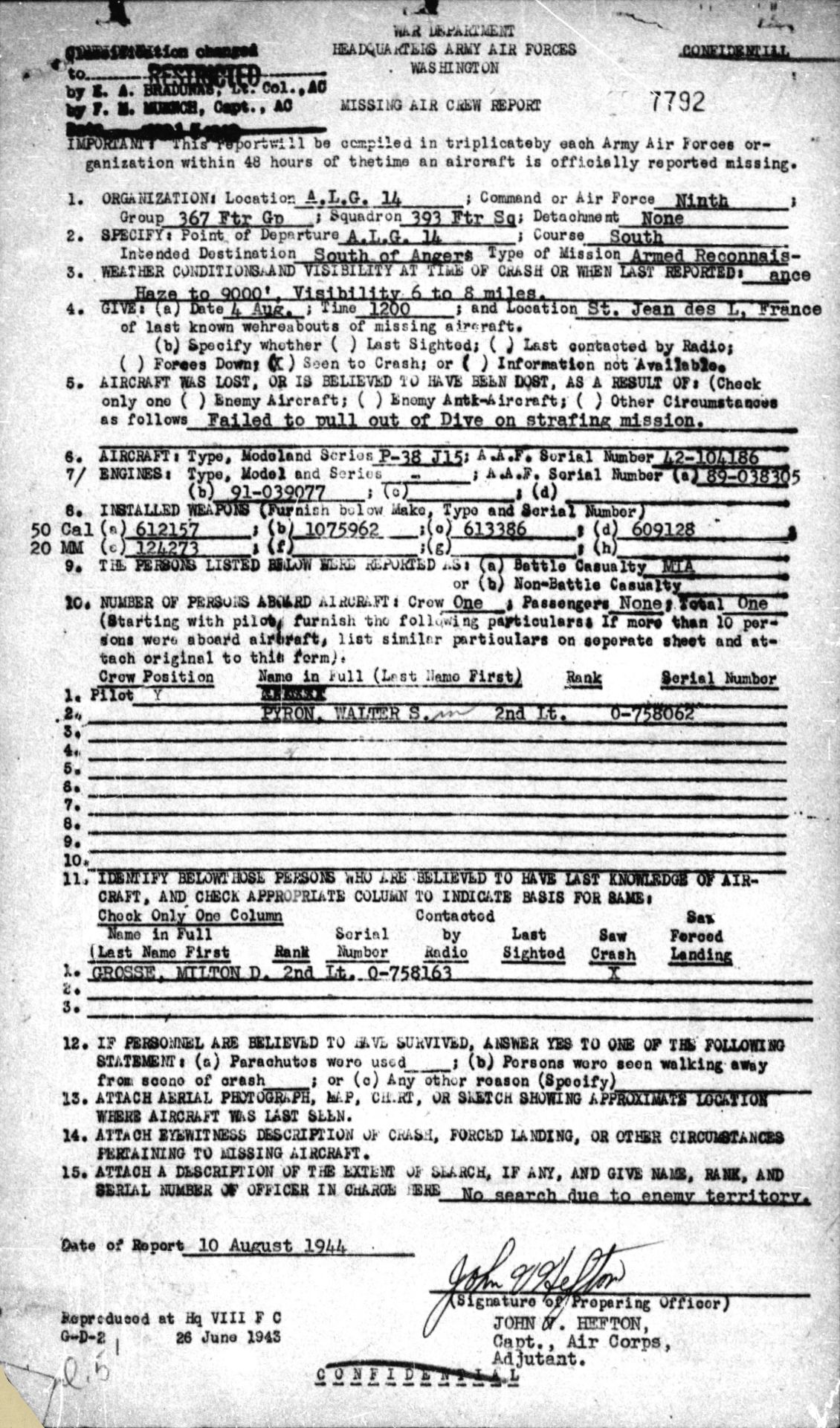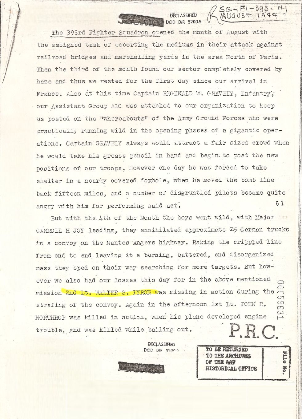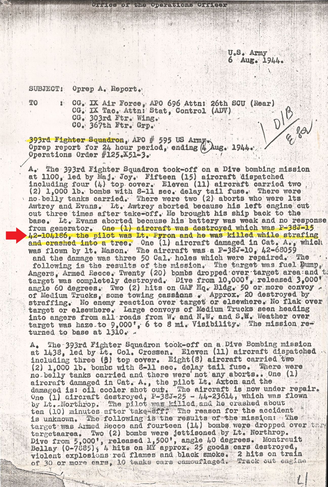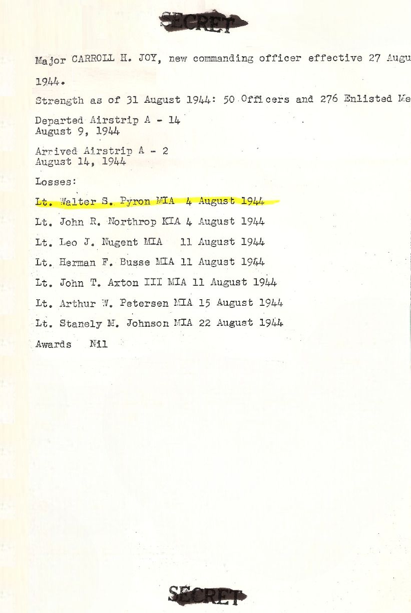 Ce document confirme la perte du 2nd Lt Pyron ainsi que celle du 1st Lt Northrop, ce dernier ayant été tué lors de son parachutage suite à des ennuis de moteur.
