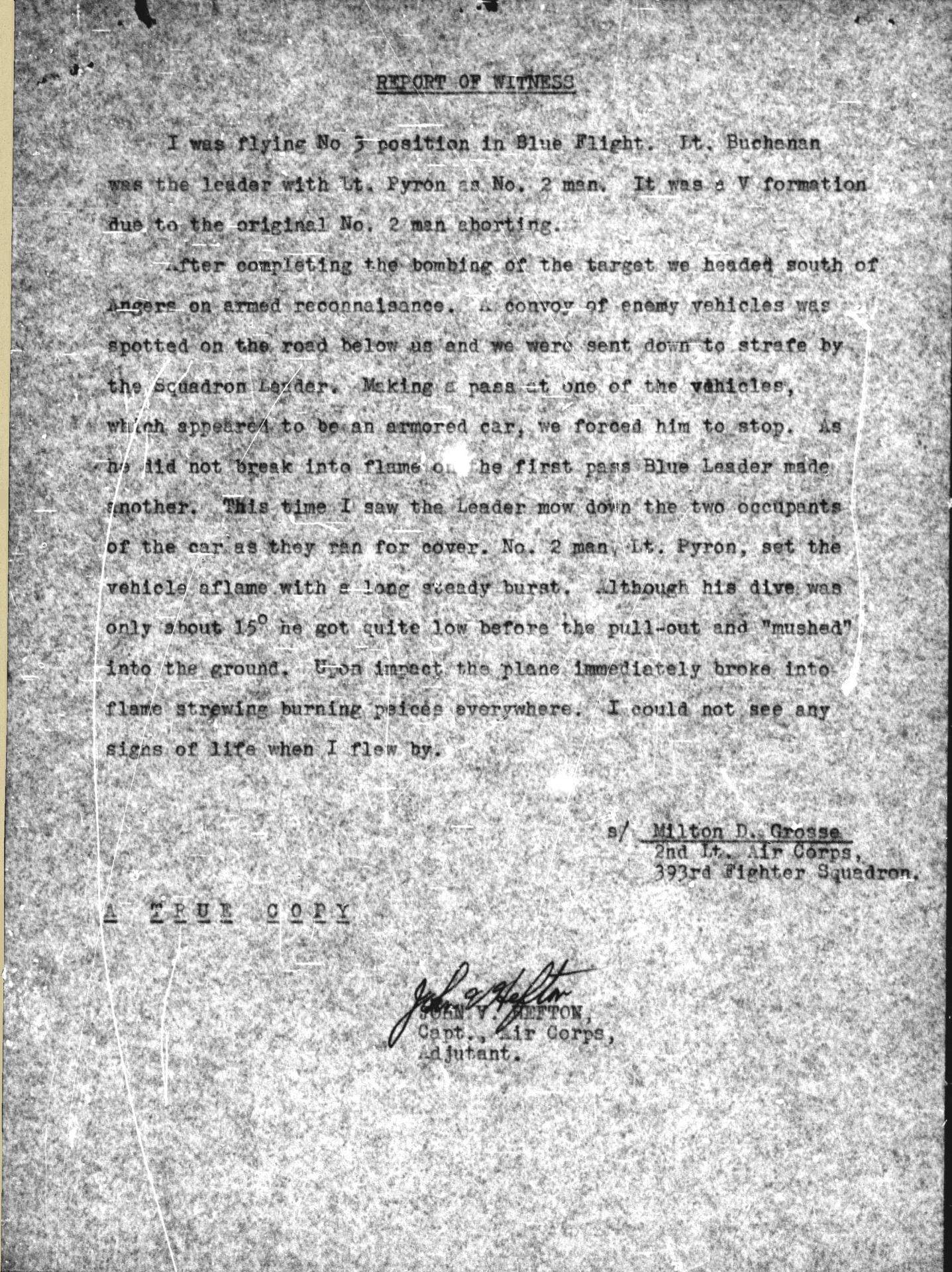 Après avoir terminé le bombardement de la cible, nous nous sommes dirigés au sud d’Angers pour une mission de reconnaissance armée. Un convoi de véhicules ennemis a été repéré sur la route en dessous de nous, et le chef d’escadrille nous a ordonné de descendre pour mitrailler. Lors d’un passage sur l’un des véhicules, qui semblait être une voiture blindée, nous l’avons forcé à s’arrêter. Comme il ne s’est pas enflammé lors du premier passage, le leader Blue en a effectué un autre. Cette fois, j’ai vu le leader abattre les deux occupants de la voiture alors qu’ils couraient se mettre à couvert. Le n°2, le lieutenant Pyron, a incendié le véhicule avec une longue rafale continue. Bien que son piqué n’ait été que d’environ 15°, il est descendu très bas avant la ressource et a “décroché” en heurtant le sol. À l’impact, l’avion a immédiatement pris feu en dispersant des débris en flammes partout. Je n’ai vu aucun signe de vie lorsque je suis passé."