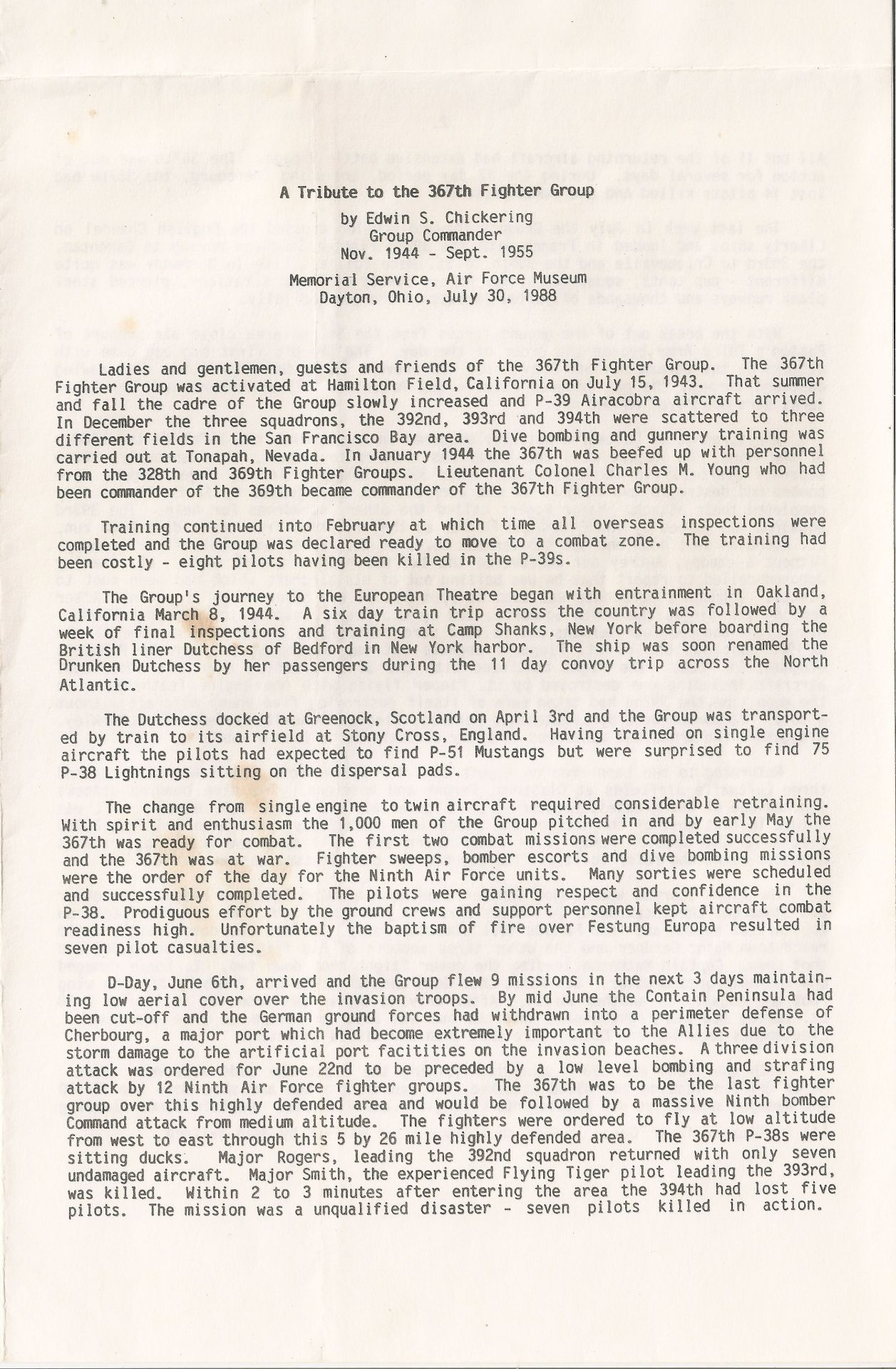 ♦ Discours d'hommage au 367th Fighter Group, par le Group Commander Edwin S. Chickering, Dayton, 30 juillet 1988.