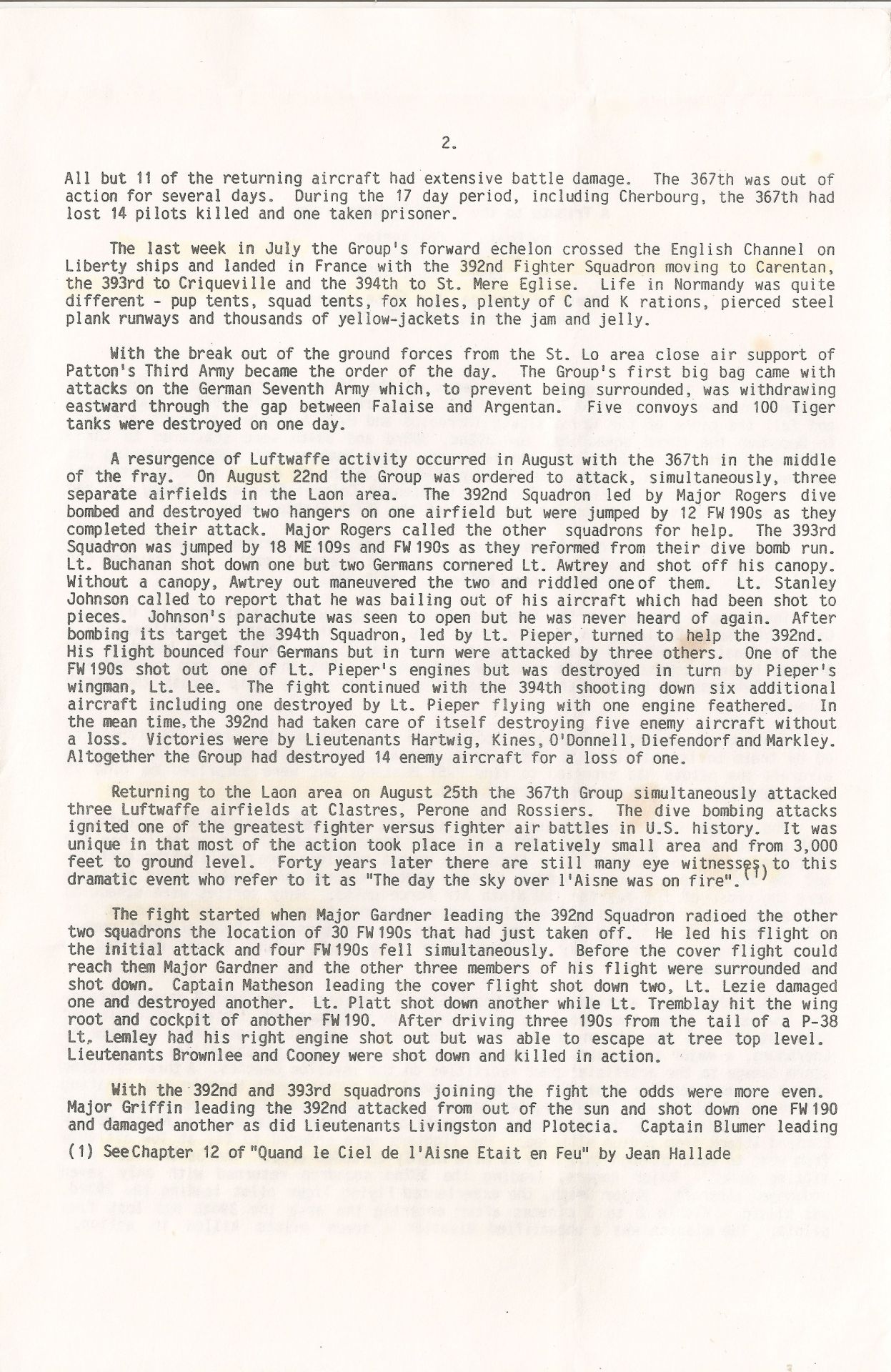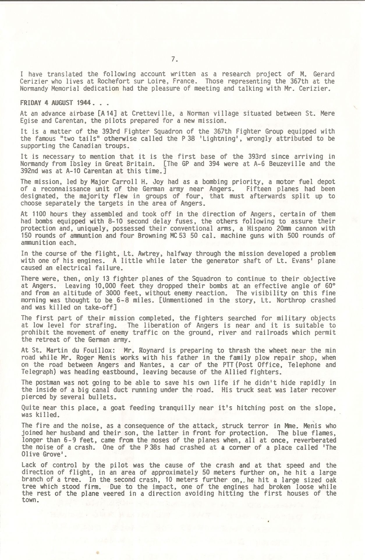 " Sur une base aérienne avancée [A 14] à Cretteville, un village normand situé entre St. Mère Église et Carentan, les pilotes se préparaient pour une nouvelle mission. Il s'agissait du 393rd Fighter Squadron du 367th Fighter Group, équipé des célèbres " deux queues ", autrement appelés les P-38 " Lightning ", à tort attribués au soutien des troupes canadiennes. Il est nécessaire de mentionner que c'était la première base du 393rd depuis son arrivée en Normandie depuis Ibsley, en Grande-Bretagne. [Le groupe et le 394th étaient à A-6 Beuzeville et le 392nd était à A-10 Carentan à cette époque.]