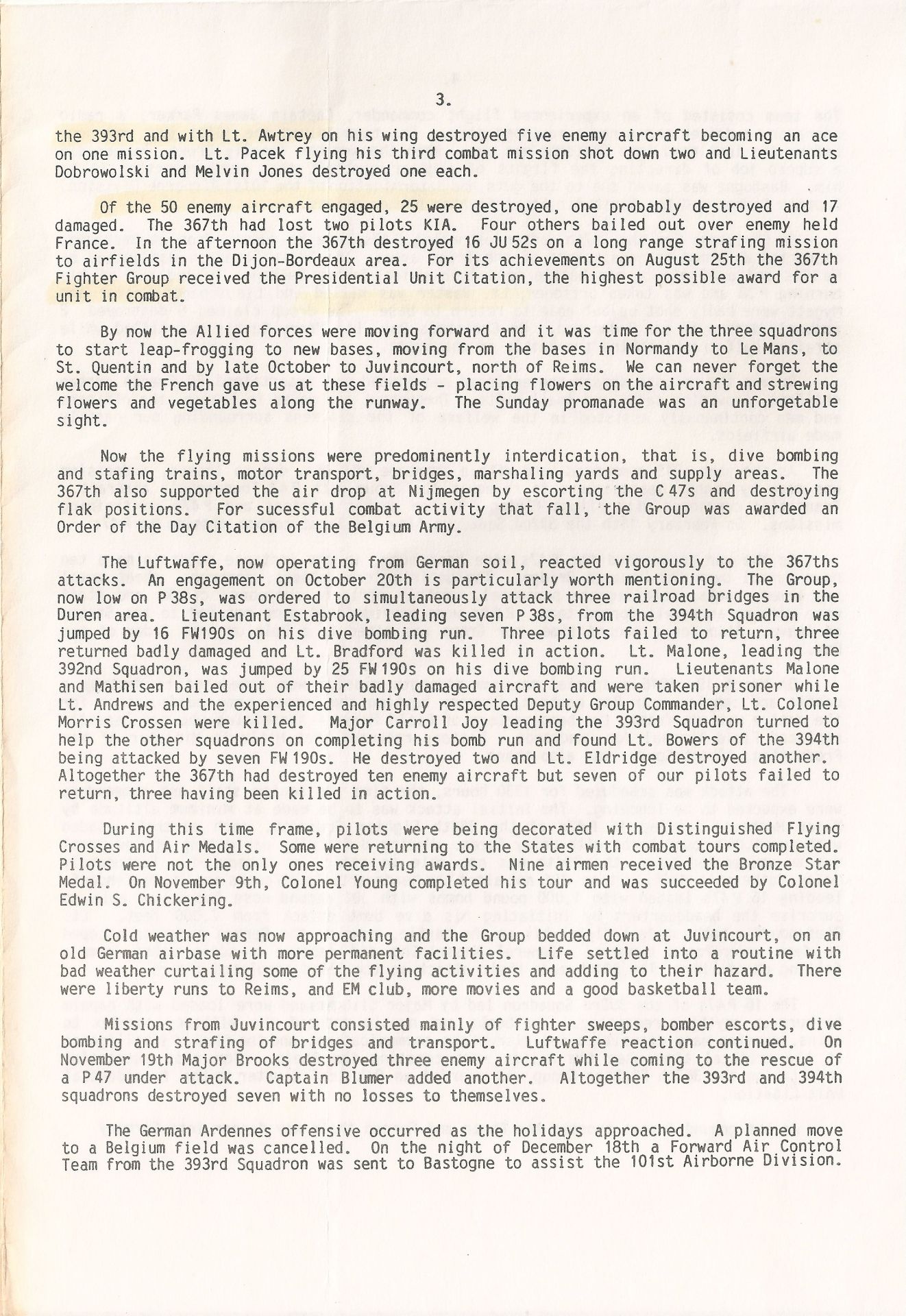 Alors que la guerre progressait, les P-47 étaient très occupés, menant notamment une patrouille de dix heures au-dessus du pont de Remagen. Les chefs d'équipe, infatigables, les armuriers, les réparateurs de tôle, les cuisiniers, le personnel de renseignement, l'officier météo, les chirurgiens, les commis et le personnel travaillaient comme une équipe bien soudée. Des permissions de repos et de récupération ont été accordées et certains ont été envoyés en permission aux États-Unis. Pour la deuxième fois, notre groupe a été cité dans un Ordre du Jour de l'Armée Belge.