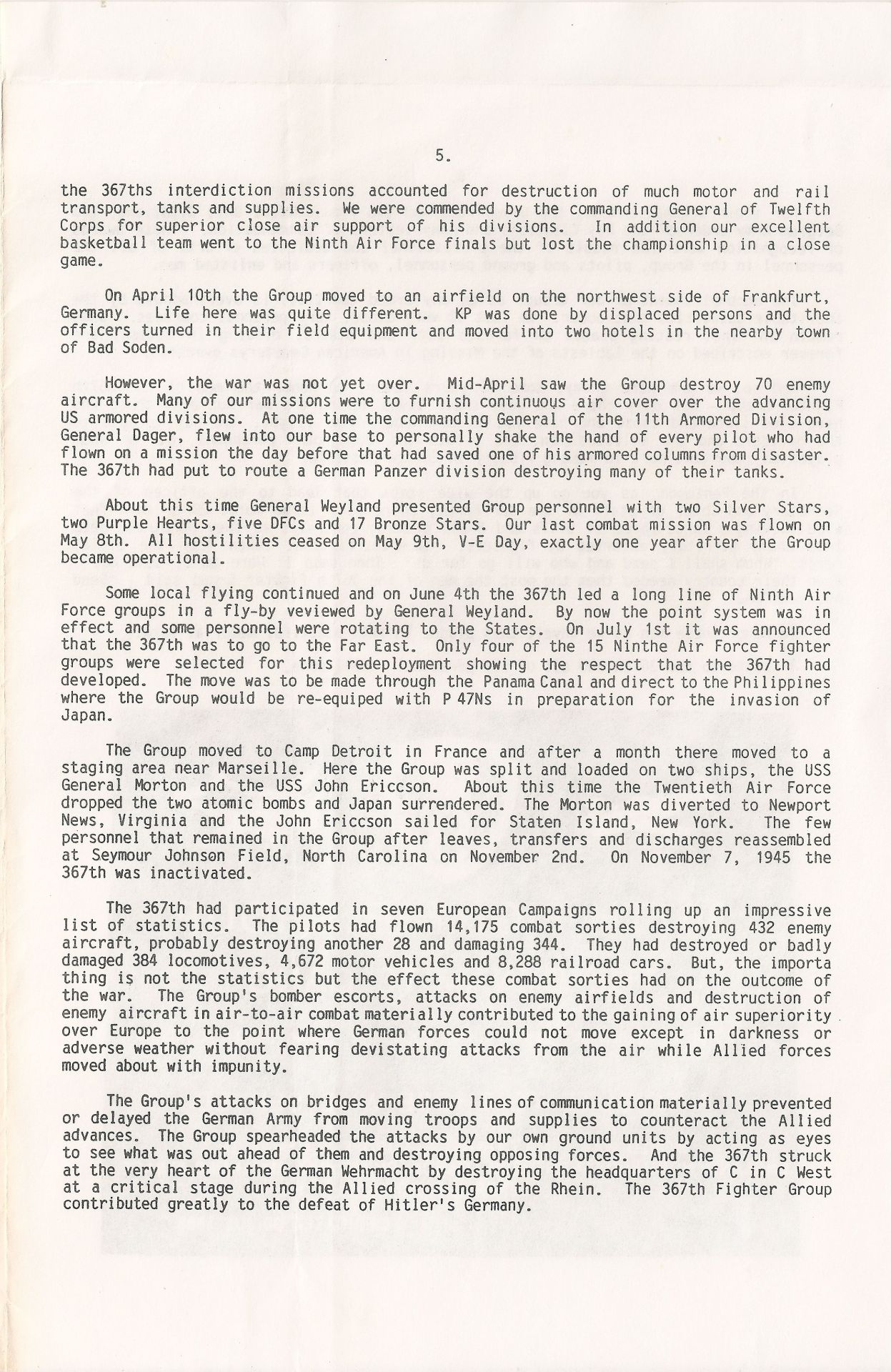 Les attaques du groupe sur les ponts et les lignes de communication ennemies ont empêché ou retardé de manière significative l'armée allemande de déplacer des troupes et des approvisionnements pour contrer les avancées alliées. Le groupe a ouvert la voie aux attaques de nos propres unités terrestres en agissant comme des yeux pour voir ce qui se trouvait devant elles et en détruisant les forces opposées. Et le 367th a frappé au cœur même de la Wehrmacht allemande en détruisant le quartier général du " Commander in Chief " West à un moment critique pendant la traversée du Rhin par les Alliés. Le 367th Fighter Group a grandement contribué à la défaite de l'Allemagne hitlérienne.