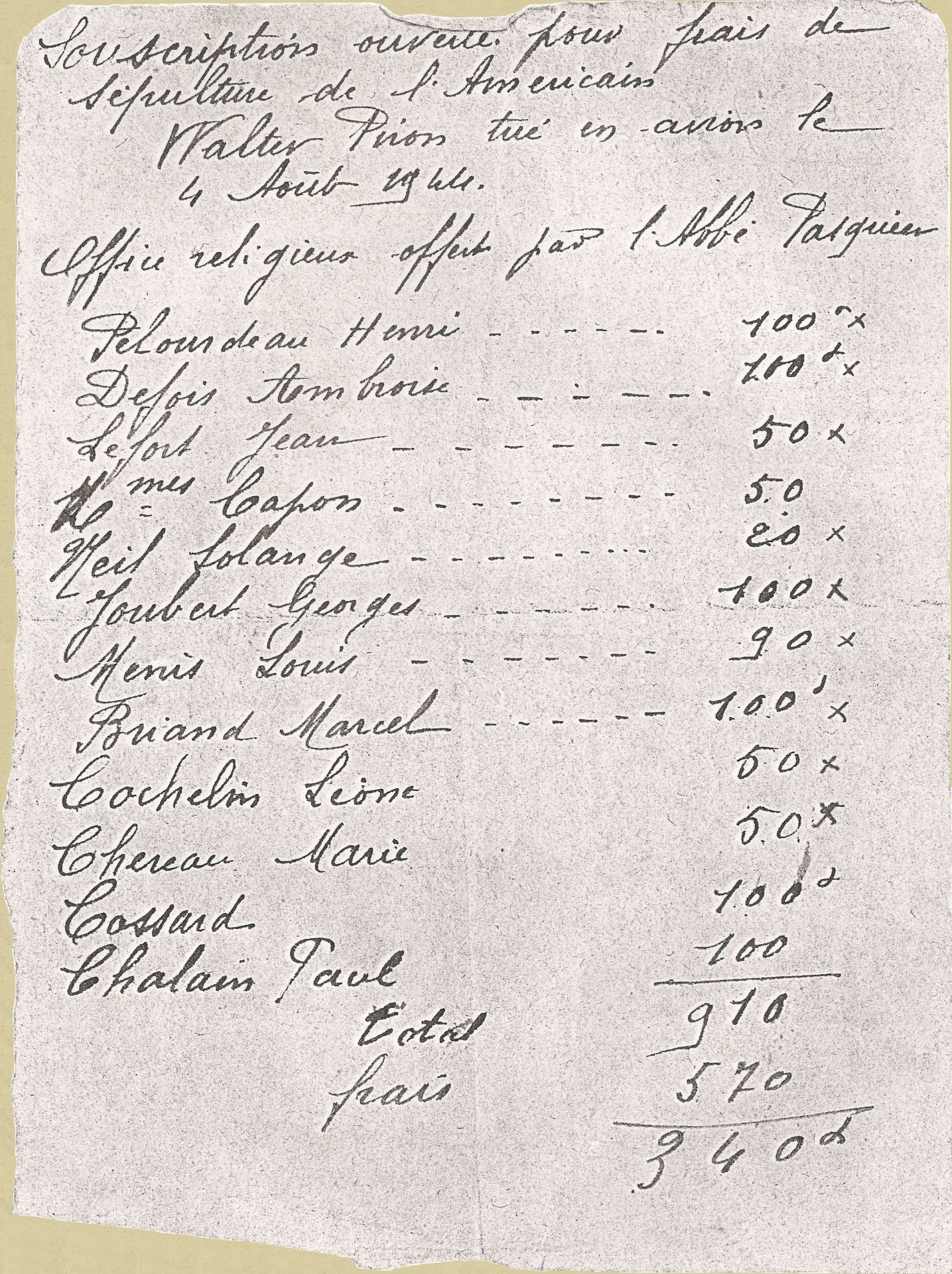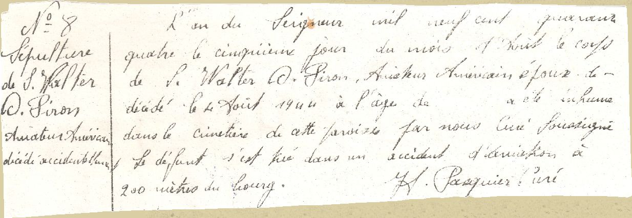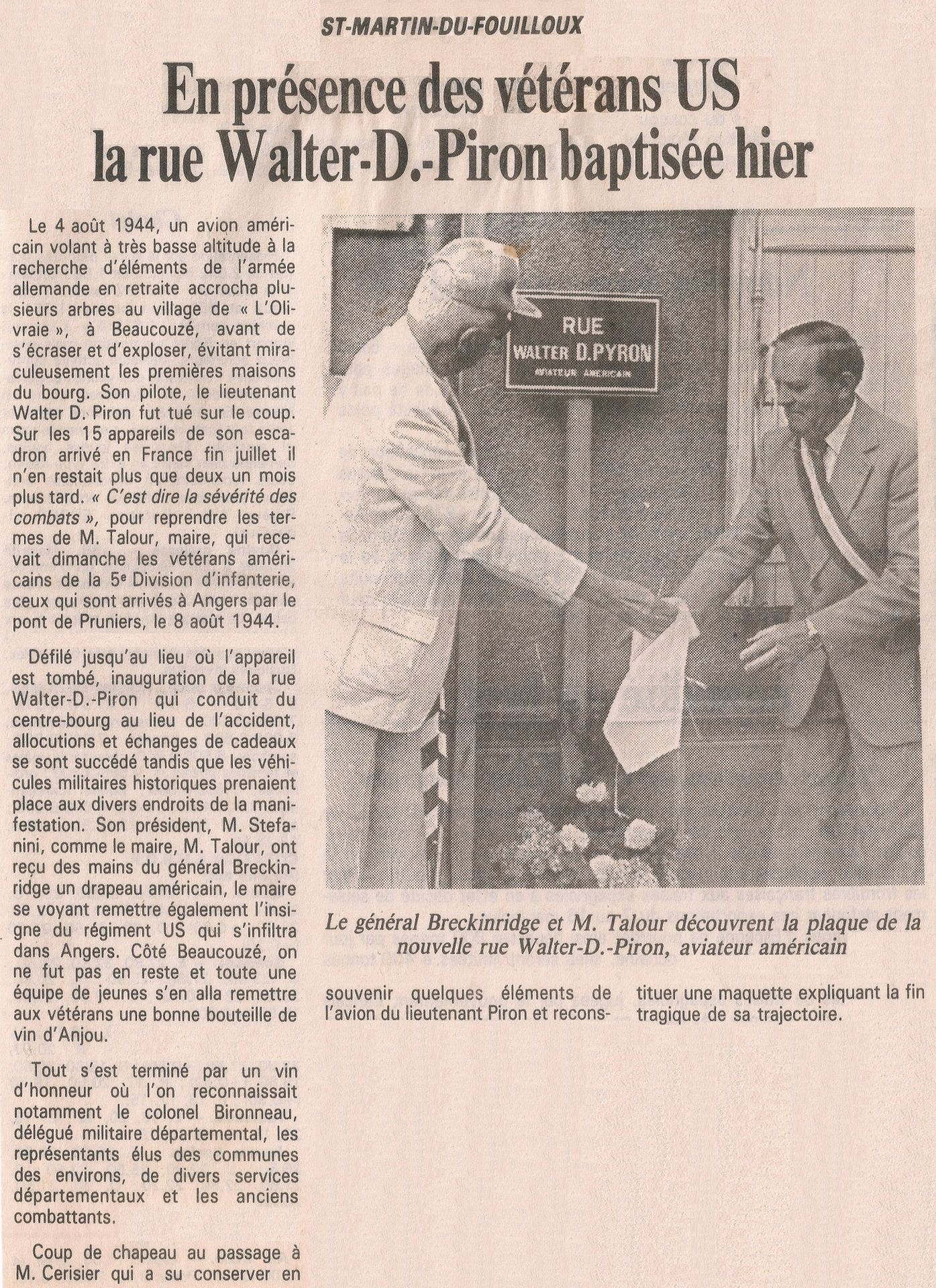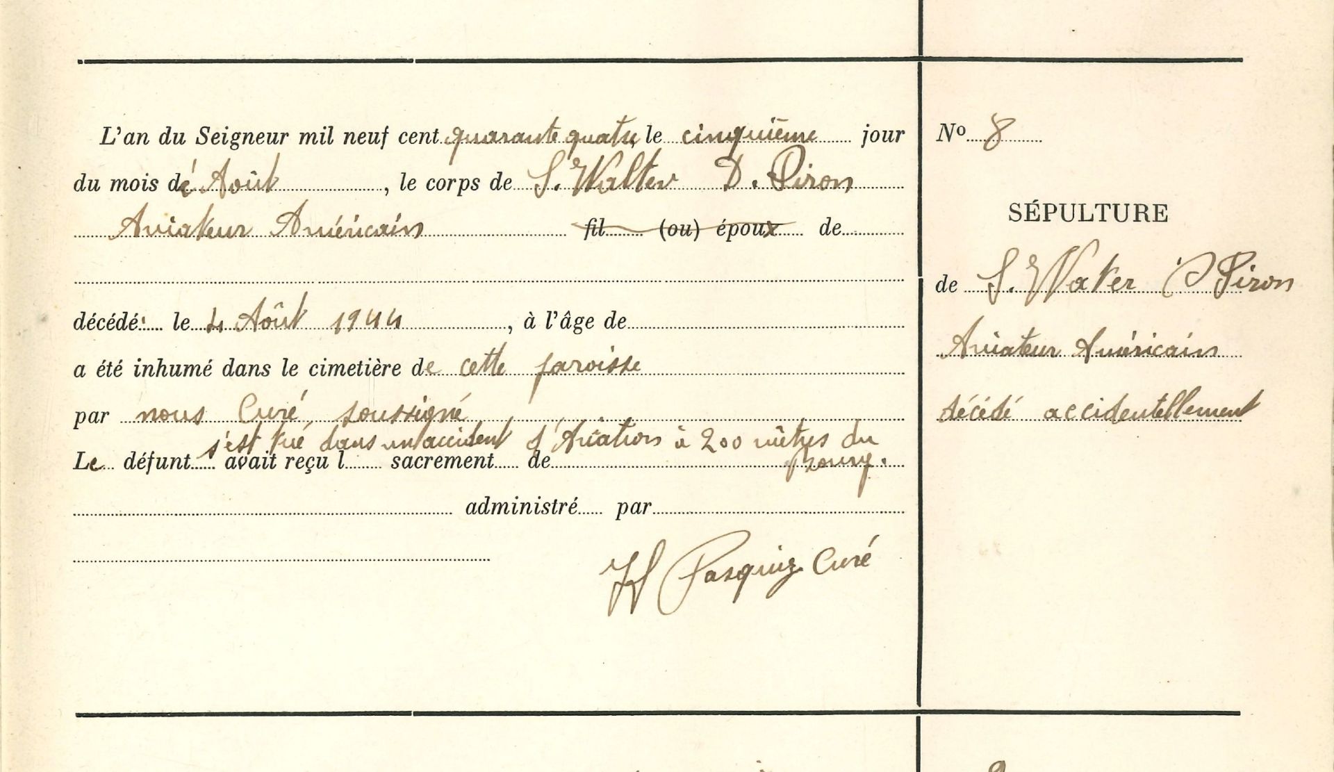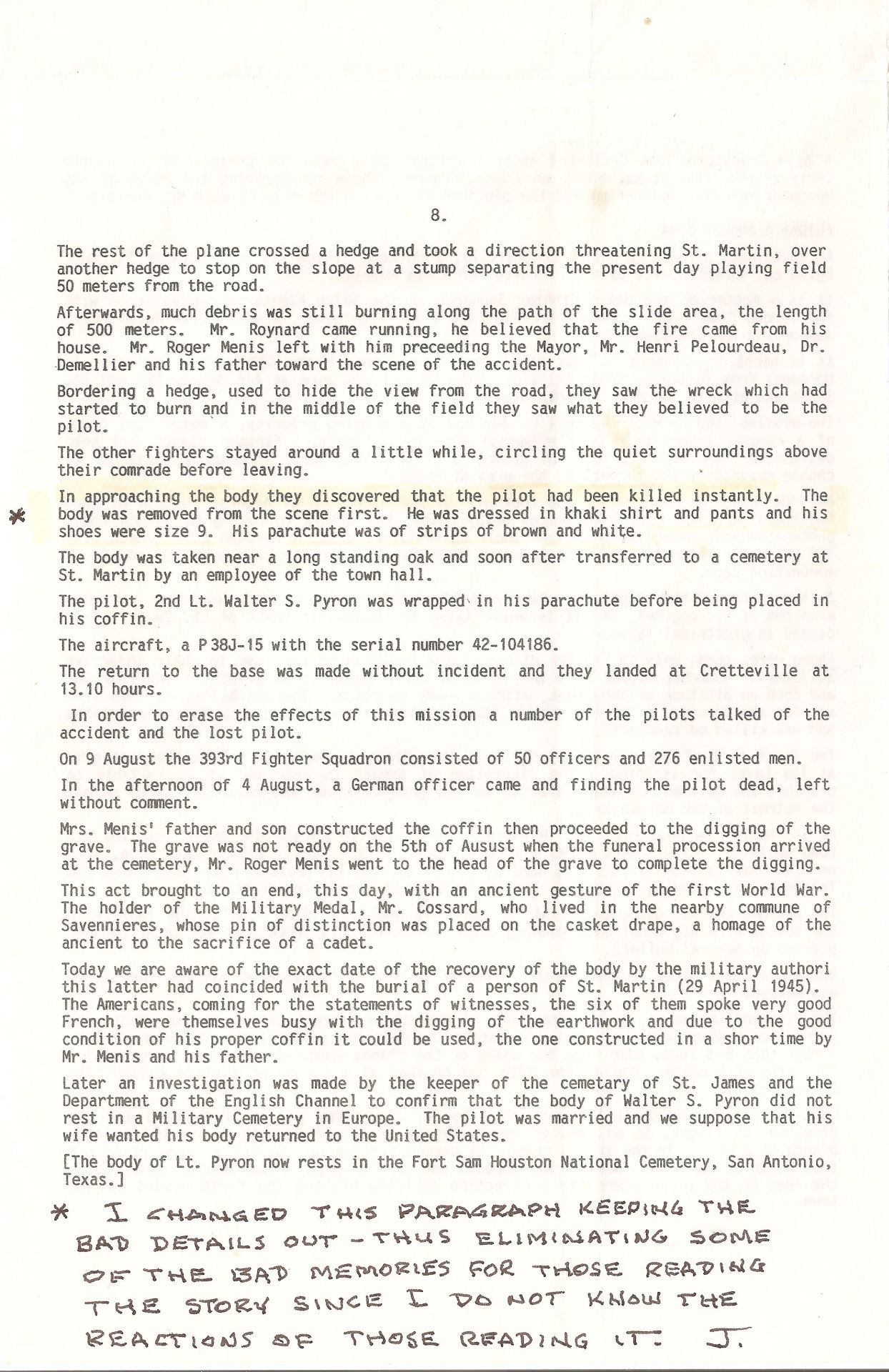 Aujourd'hui, nous connaissons la date exacte du crash et de la mort de S. Walter D. Piron (4 août 1944) grâce à l'extrait de décès retrouvé dans les archives de l'église ainsi que celle du relèvement du corps par les autorités militaires, cette dernière coïncidant avec la sépulture d'une habitante de Saint Martin (29 avril 1945). Les américains (aux dires des témoins) au nombre de six, parlant très bien le français, se sont occupés des travaux de terrassement et malgré l'apport de leur propre cercueil aurait conservé celui construit un an plus tôt par Mr Menis et son père. Plus tard, une enquête fut menée par le gardien du cimetière de Saint-James et le Département de la Manche pour confirmer que le corps de Walter S. Pyron ne reposait pas dans un cimetière militaire en Europe. Le pilote était marié et nous supposons que sa femme a voulu que son corps soit rapatrié aux États-Unis ".