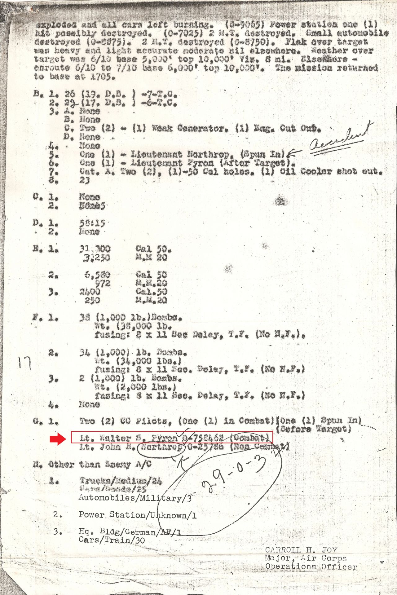 Ce document confirme les détails de la mission (15 avions au décollage, 2 avions qui reviennent sur ennuis mécaniques, le crash au décollage du Lt Northrop, et bien sûr la perte de Walter S. Pyron).