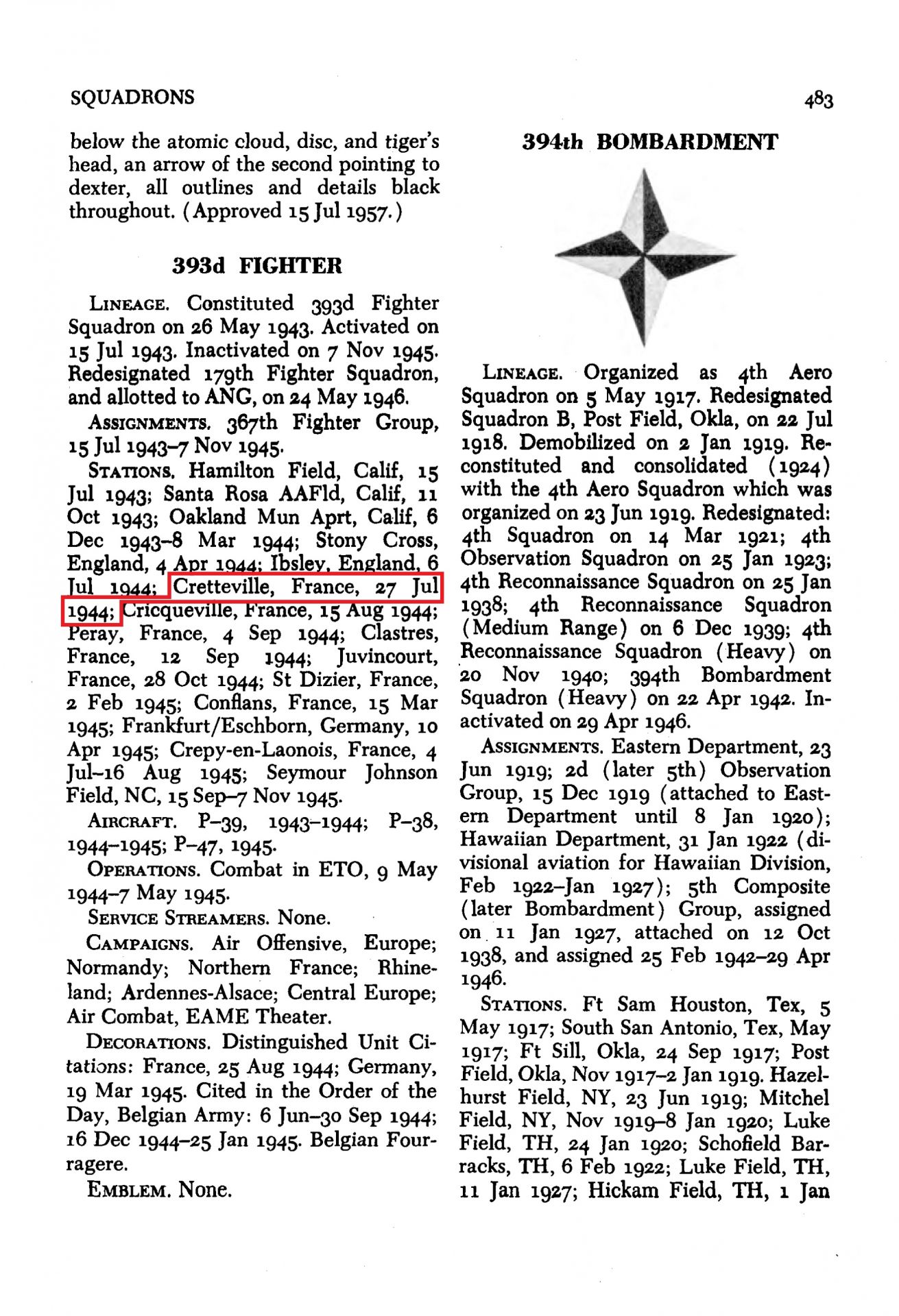 Ce document confirme la présence du 393rd Squadron sur le terrain avancé de Cretteville du 27 juillet au 15 août 1944, terrain d'où est parti Walter Pyron le 4 août 1944.