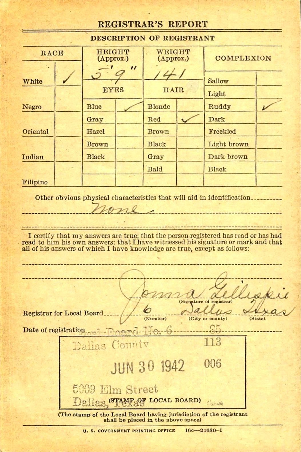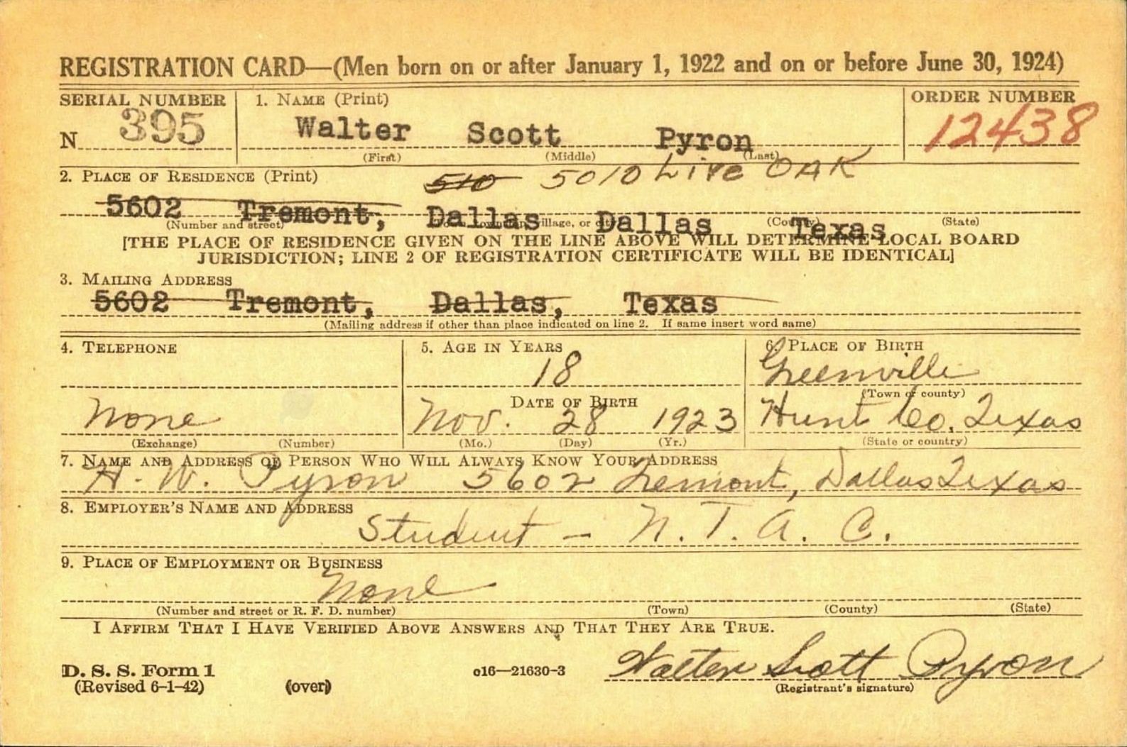 ♦ Carte d'enregistrement militaire (effectué par Walter Pyron le 30 juin 1942 à Dallas).