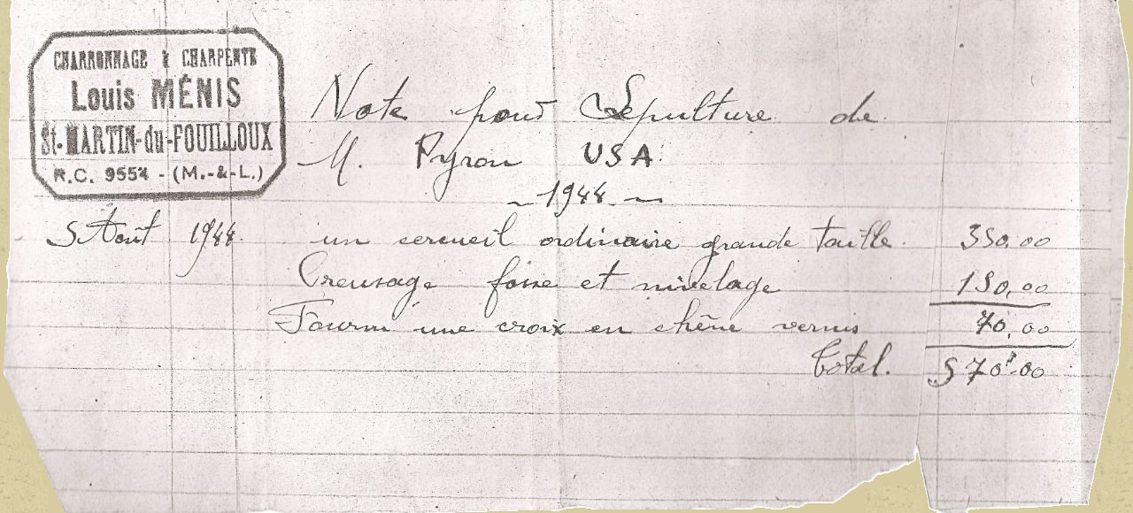 Ce document, établi par l'abbé Pasquier, atteste de l'inhumation de Walter Pyron le 5 août 1944 au cimetière de Saint-Martin-du-Fouilloux.