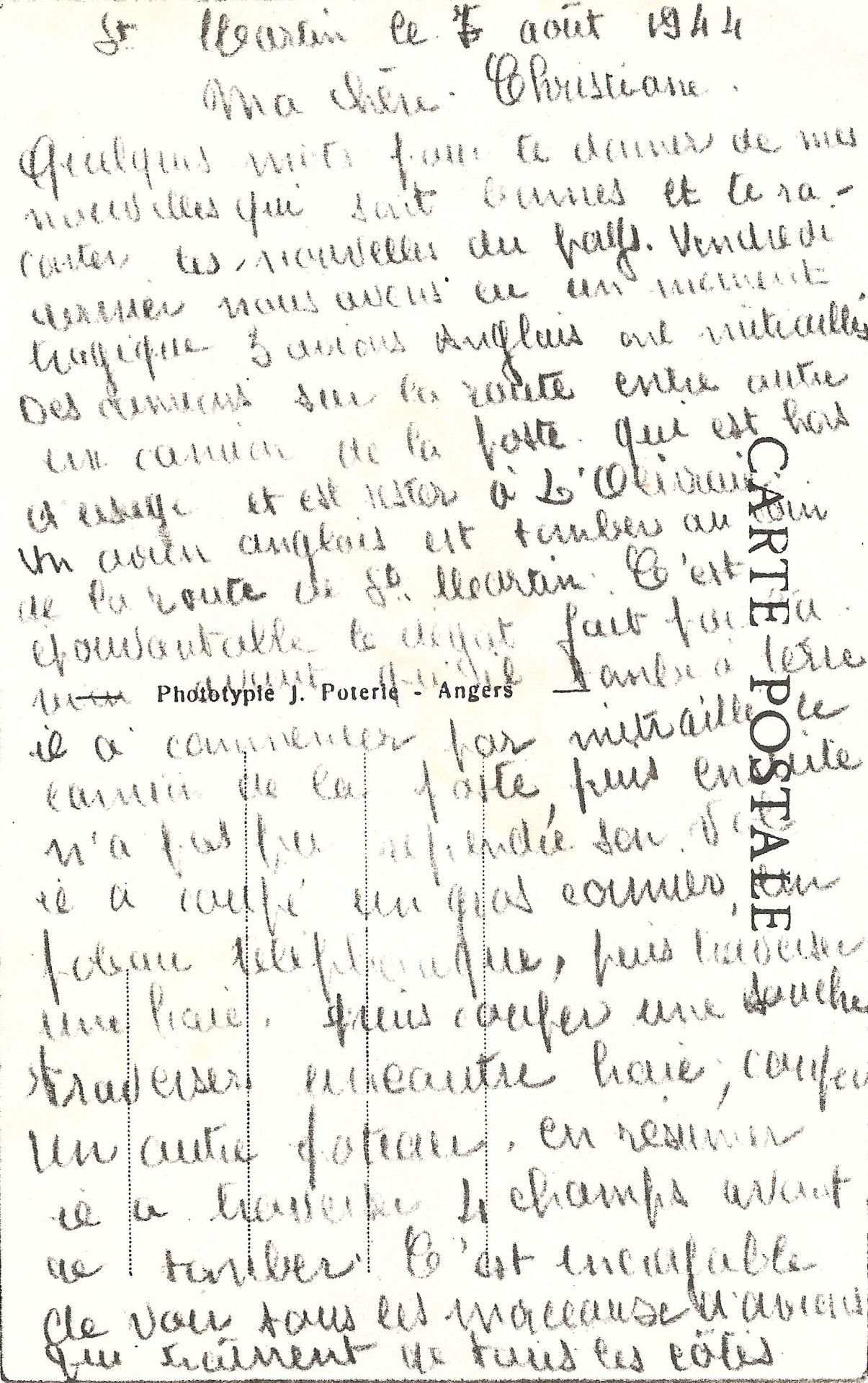 Quelques mots pour te donner de mes nouvelles qui sont bonnes et te raconter les nouvelles du pays. Vendredi dernier nous avons eu un moment tragique. 3 avions Anglais ont mitraillé des camions sur la route entre autres un camion de la poste qui est hors d’usage et est resté à l’Oliveraie. Un avion anglais est tombé au coin de la route de Saint-Martin. C’est épouvantable le dégât fait par cet avion avant qu’il ne tombe à terre. Il a commencé par mitrailler le camion de la poste puis ensuite n’a pas pu reprendre son vol. Il a coupé un gros cormier, un poteau téléphonique, puis traversé une haie, puis coupé une souche, traversé une autre haie, couper un autre poteau. En résumé, il a traversé 4 champs avant de tomber. C’est incroyable de voir tous ces morceaux d’avion qui traînent de tous les côtés. "