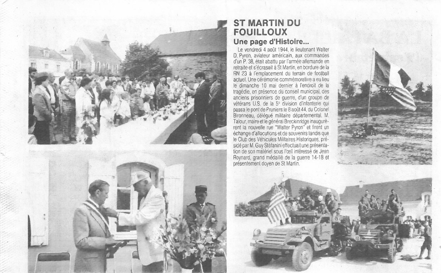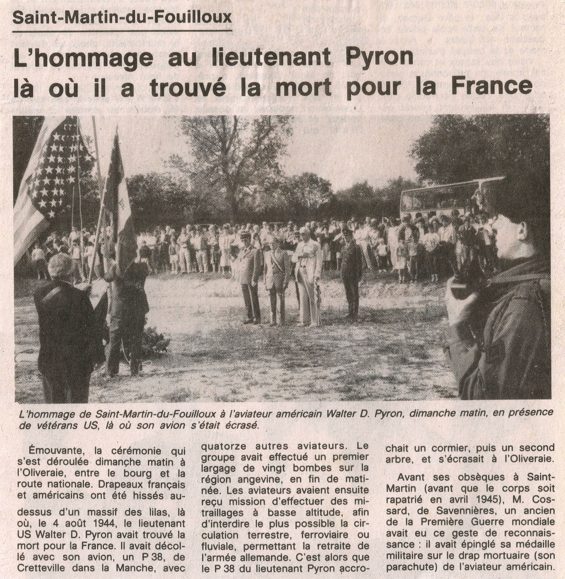 Walter Scott PYRON est né à Greenville, au Texas. Il grandit à Dallas et obtient son dîplome de l'École agricole du Nord du Texas à Arlington en 1943, après avoir été diplômé du lycée Woodrow Wilson. Il effectue son recensement militaire le 30 juin 1942 à Dallas. 8 mois après être entré dans l'Air Force, il obtient son brevet de pilote le 3 février 1943 à Williams Field en Arizona (USA). Il rejoint le 393rd Fighter Squadron en avrill 1944. Après la percée de Saint-Lô et d'Avranches en Normandie fin juillet, la IXth Air Force, et en particulier la 9th Tactical Air Force, est engagée dans une vaste action de soutien à l'armée Patton, via des missions de reconnaissance et d'attaque sur les arrières ennemis. Les P-38 Lightning du 367th FG - 393th FS rejoignent me 27 juillet 1944 les P-47 Thunderbolt sur le terrain avancé A-14 à Cretteville, dans la Manche. C'est de ce terrain que PYRON décolle à 11 heures, le 4 août pour une mission de bombardement d'un dépôt de carburant à Angers (49). 15 avions participent au départ à cette mission mais deux retournent au terrain suite à des problèmes mécaniques. C'est la vingt-septième mission de Walter Pyron. Le trajet s'effectue à 10 000 pieds (3 000 mètres) et le bombardement à 3 000 pieds (1 000 mètres) par un piqué à 60°. Il n'y a pas d'opposition allemande. Puis chaque patrouille passe à la 2e partie de la mission, à savoir des attaques sur le trafic routier. La patrouille Blue dans laquelle se trouve Pyron, attaque une voiture sur la nationale 23 Angers-Nantes au niveau de Saint-Martin du Fouilloux. Il détruise le véhicule mais son conducteur, un agent de la poste, s'en tire miraculeusement. Malheureusement, lors de l'attaque en rase-mottes, Pyron accroche un arbre au hameau L'Oliveraie (actuel emplacement du terrain de sport) puis percute un gros chêne 100 mètres plus loin. L'avion se disloque et brûle, Pyron est éjecté et tué ; il avait 21 ans. Le fuselage termine sa course contre un talus, situé sur l'actuel terrain de football de la commune. Il volait en position n°2 de la section Blue menée par le Lt Buchanan. Son crash fut observé par le 2nd Lt Milton D. Grosse. Pyron fut décoré de l'Air Medal avec 3 feuilles de chêne.