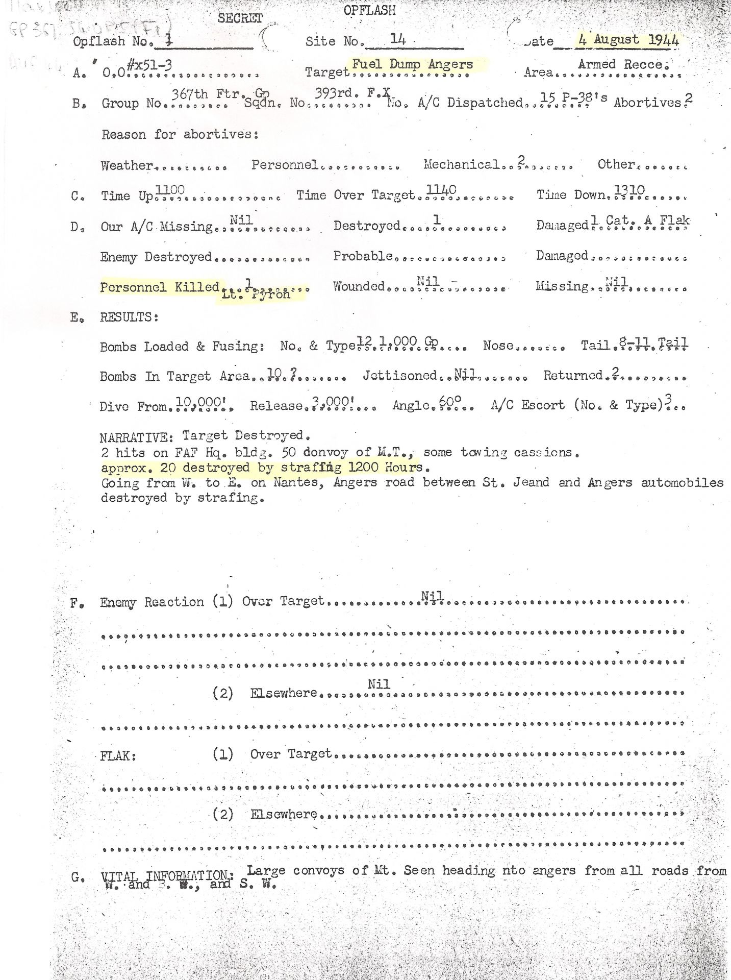 ♦ Document d'archives (Opflash) du 393rd Fighter Squadron pour 4 août 1944.