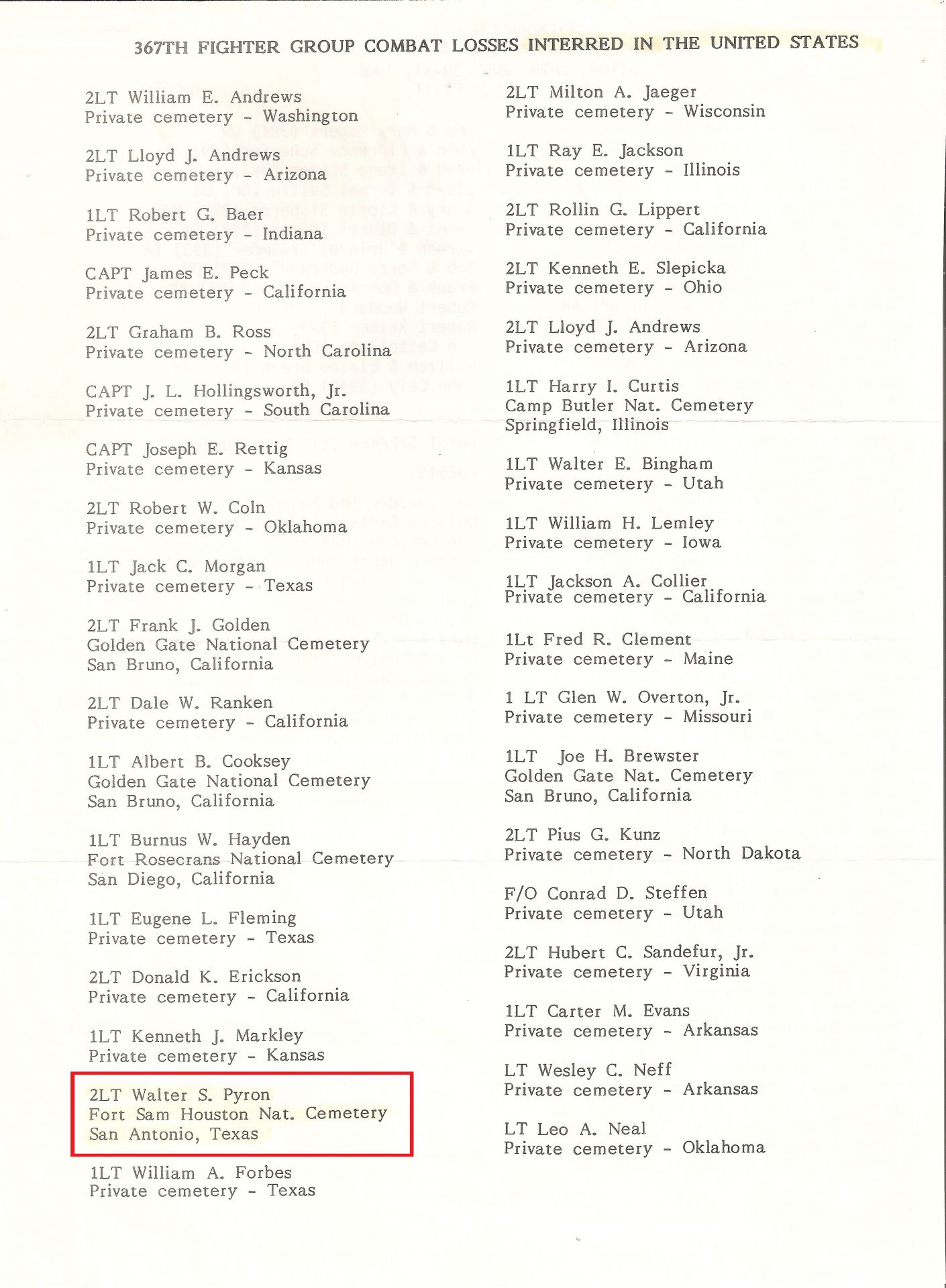 Le 2nd Lt Pyron figure dans la liste au cimetière Fort Sam Houston de San-Antonio, au Texas.