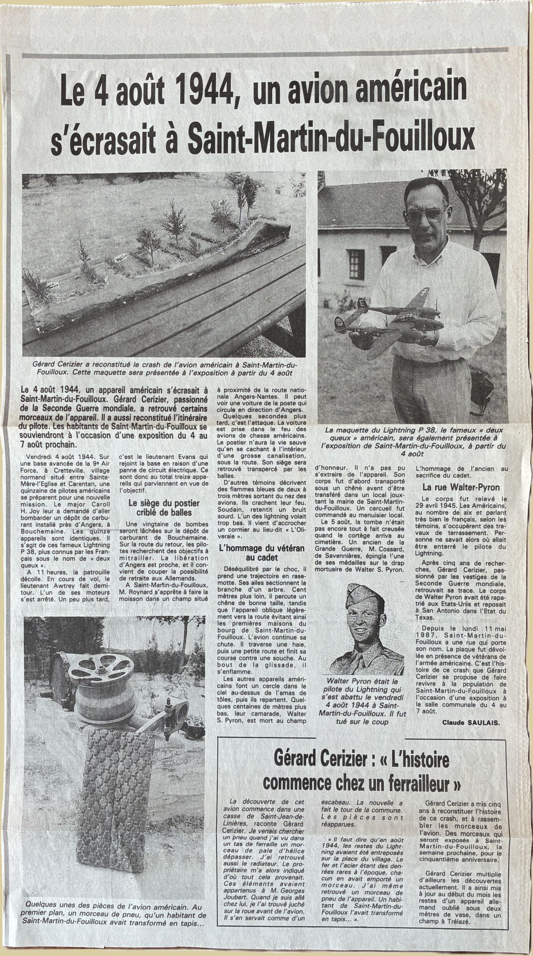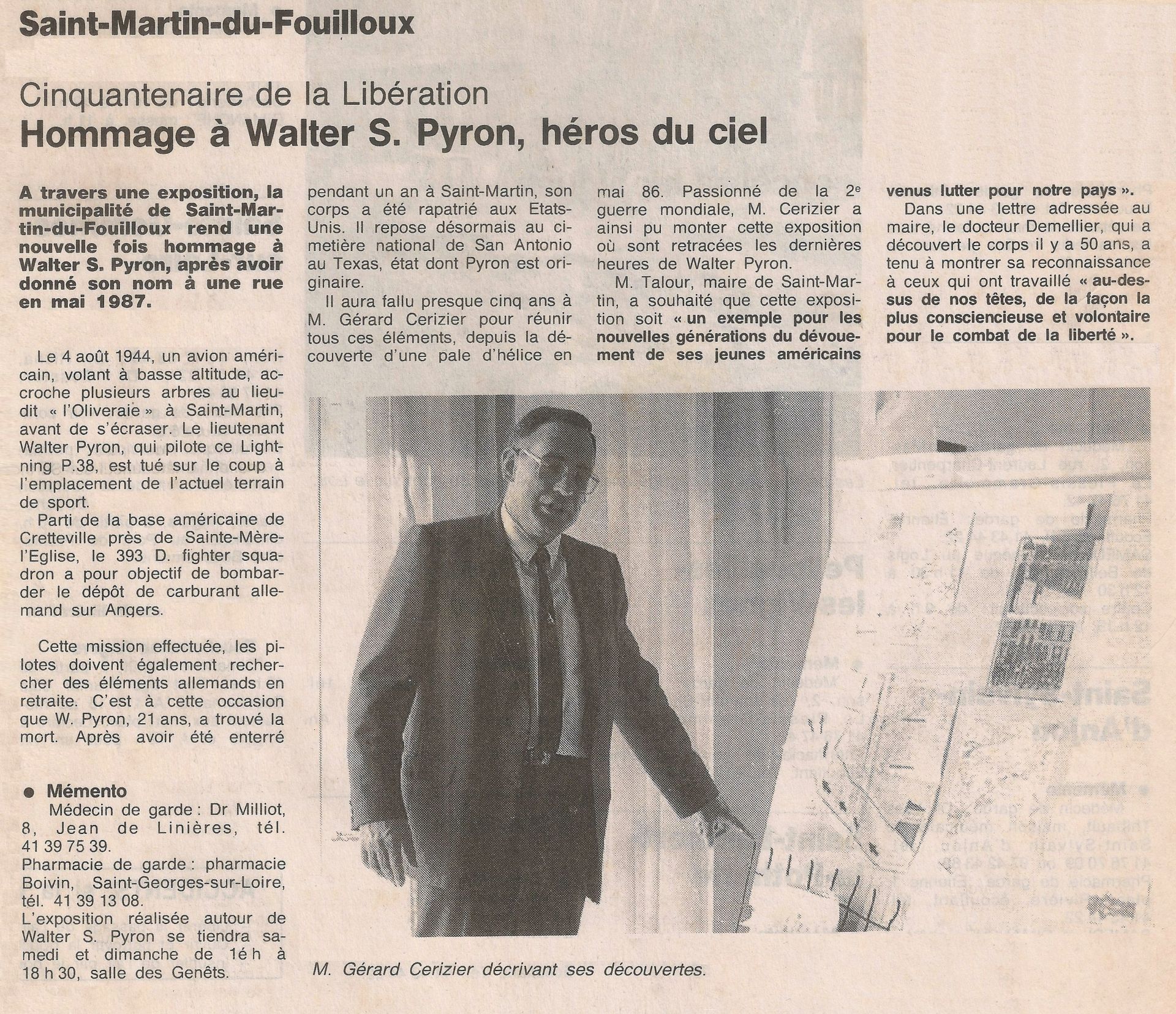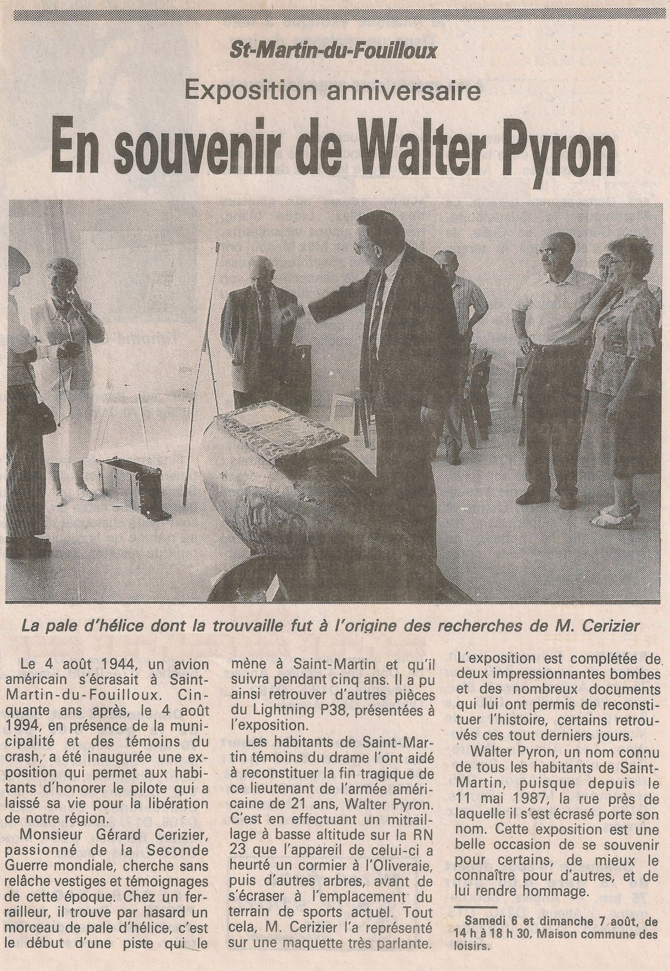 A l'initiative de Gérard Cerizier et de la mairie, une exposition des pièces de l'avion retrouvées en 1986 fut organisée salle des Genêts. Gérard Cerizier était présent pour raconter aux visiteurs l'histoire tragique de Walster S. Pyron.