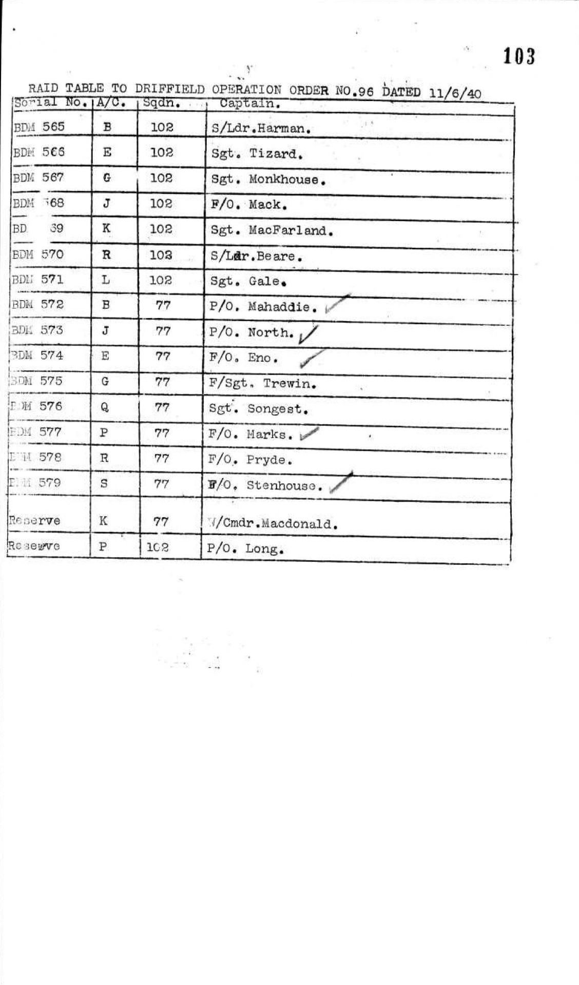 In this other page of No. 77 Squadron's ORB, we find the list of the eight crews that participated in the mission.