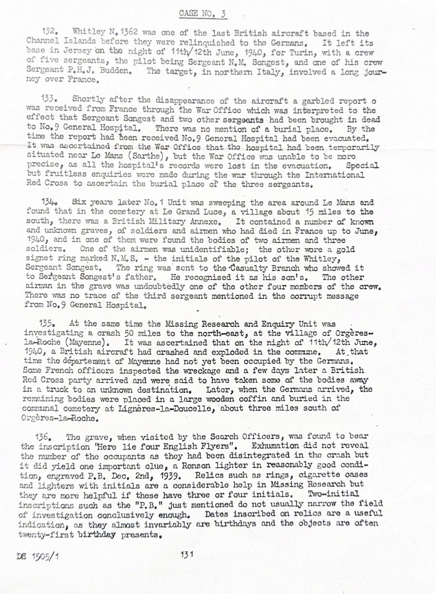 133. Peu après la disparition de l’appareil, un rapport confus fut reçu de France par l’intermédiaire du War Office, et interprété comme signifiant que le sergent Songest et deux autres sergents avaient été amenés morts au 9e Hôpital Général. Aucune mention d’un enterrement n’y figurait. Au moment où le rapport fut reçu, le 9e Hôpital Général avait déjà été évacué. On apprit du War Office que l’hôpital avait été temporairement installé près du Mans (Sarthe), mais il ne put être plus précis, tous les registres de l’hôpital ayant été perdus lors de l’évacuation. Des recherches spéciales mais infructueuses furent menées pendant la guerre, par l’intermédiaire de la Croix-Rouge internationale, pour retrouver le lieu de sépulture des trois sergents.