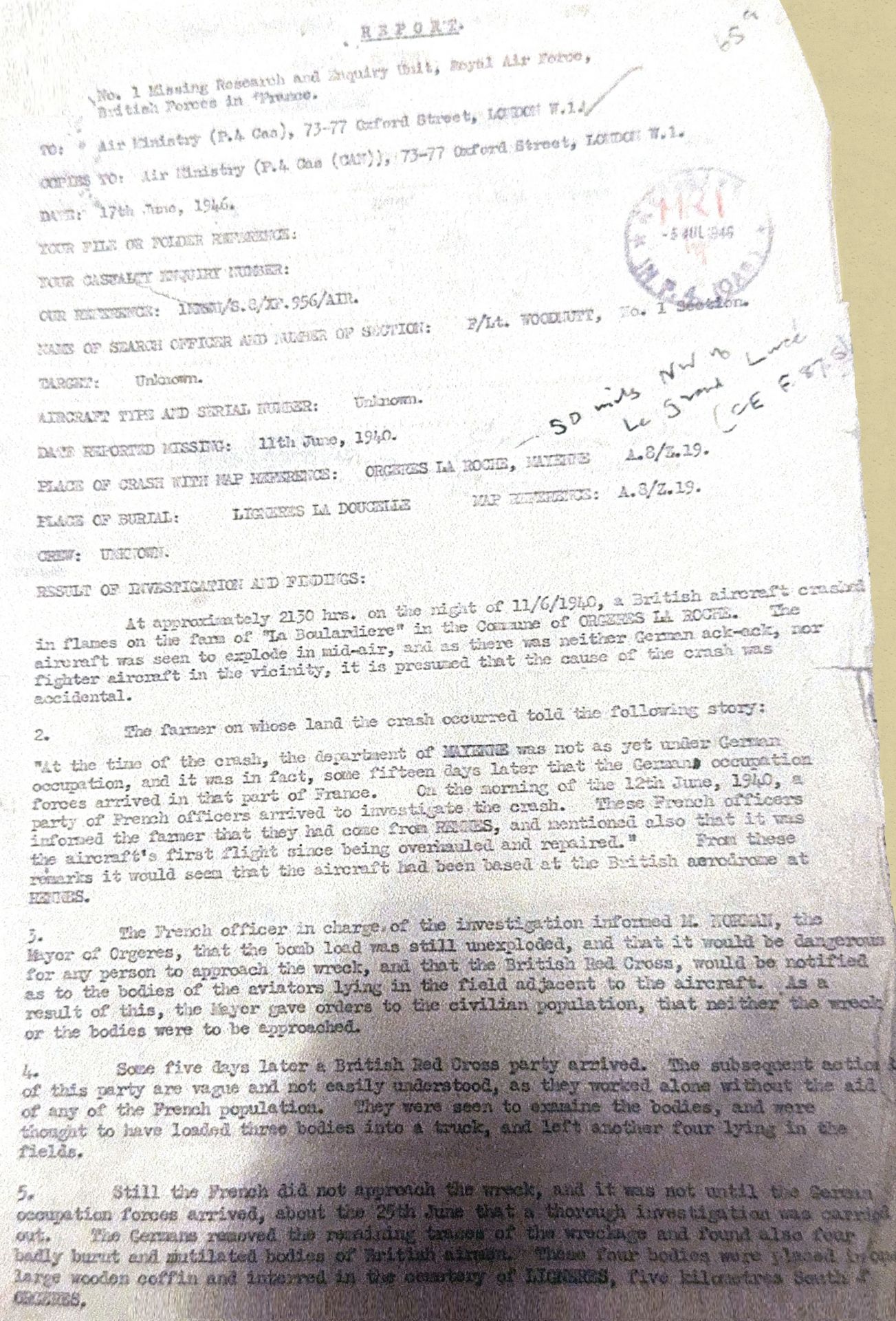 "Au moment du crash, le département de la Mayenne n’était pas encore sous occupation allemande ; ce n’est qu’environ quinze jours plus tard que les troupes allemandes sont arrivées dans cette partie de la France. Le matin du 12 juin 1940, un groupe d’officiers français est arrivé pour enquêter sur l’accident. Ils ont informé le fermier qu’ils venaient de Rennes, et ont également mentionné qu’il s’agissait du premier vol de l’appareil depuis sa révision et sa réparation. D’après ces informations, il semblerait que l’avion était basé sur l’aérodrome britannique de Rennes. »