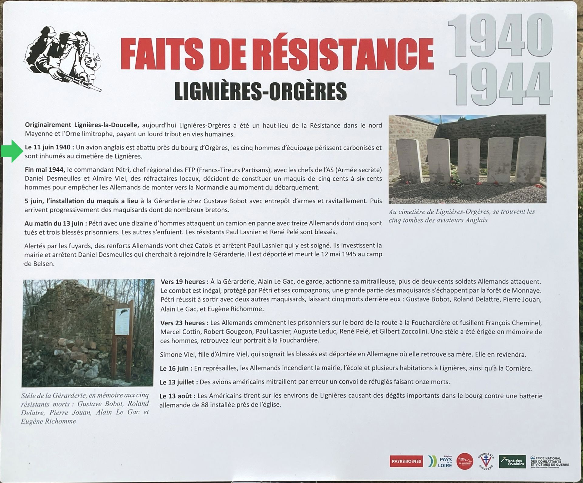 La commune de Lignières-Orgères (regroupement des communes de Lignières-la-Doucelle et Orgères-la-Roche) rend hommage aux 5 aviateurs tombés en juin 1940 au monument aux morts et sur un panneau d'information près de l'église. Les cinq aviateurs sont enterrés dans le cimetière de Lignières-Orgères (autrefois le cimetière de Lignières-la-Doucelle).