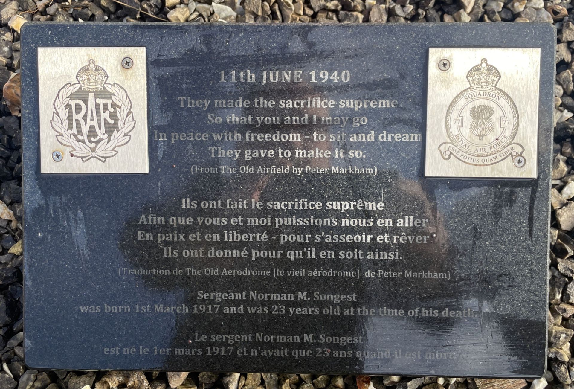 L'Operational Record Book du Squadron 77 pour juin 1940 indique que le 11 juin, l'équipage du Sergeant SONGEST est porté disparu.