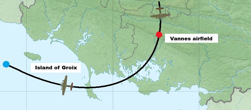 These documents (see appendices) appear to indicate the aircraft's flight path on September 23, 1943 : the aircraft arrived from the north, the flak opened fire at 9:25 a.m. ["Feueröffnung"] shortly before the airfield, then turned right towards the coast and thus towards the island of Groix, where it crashed off the coast at 9:45 a.m. (blue dot). This is what it looks like :