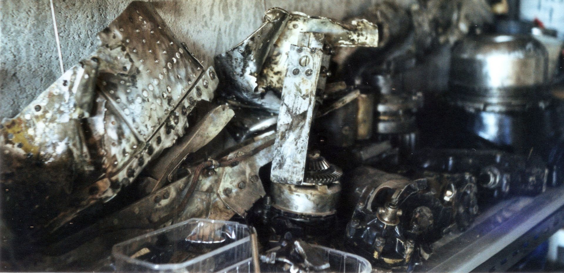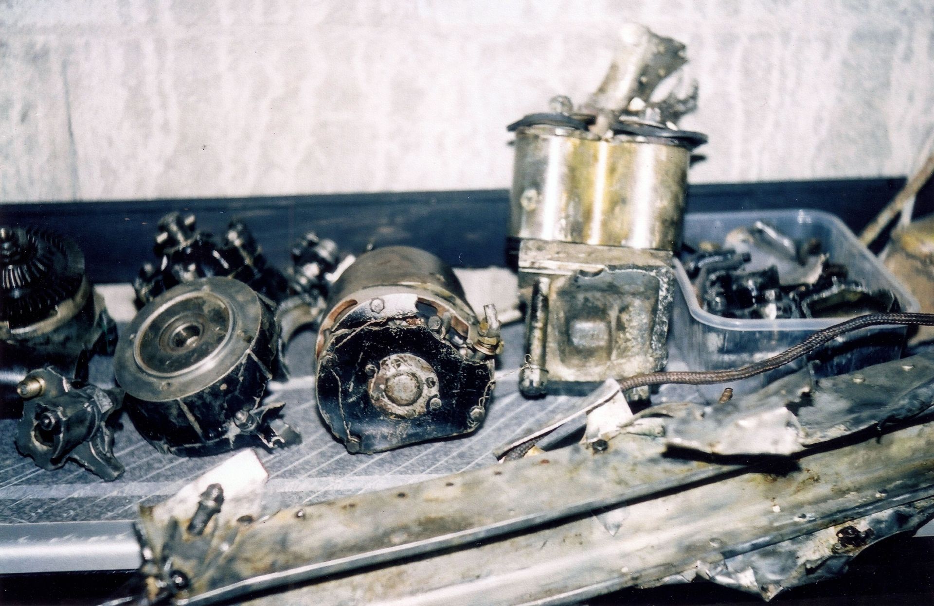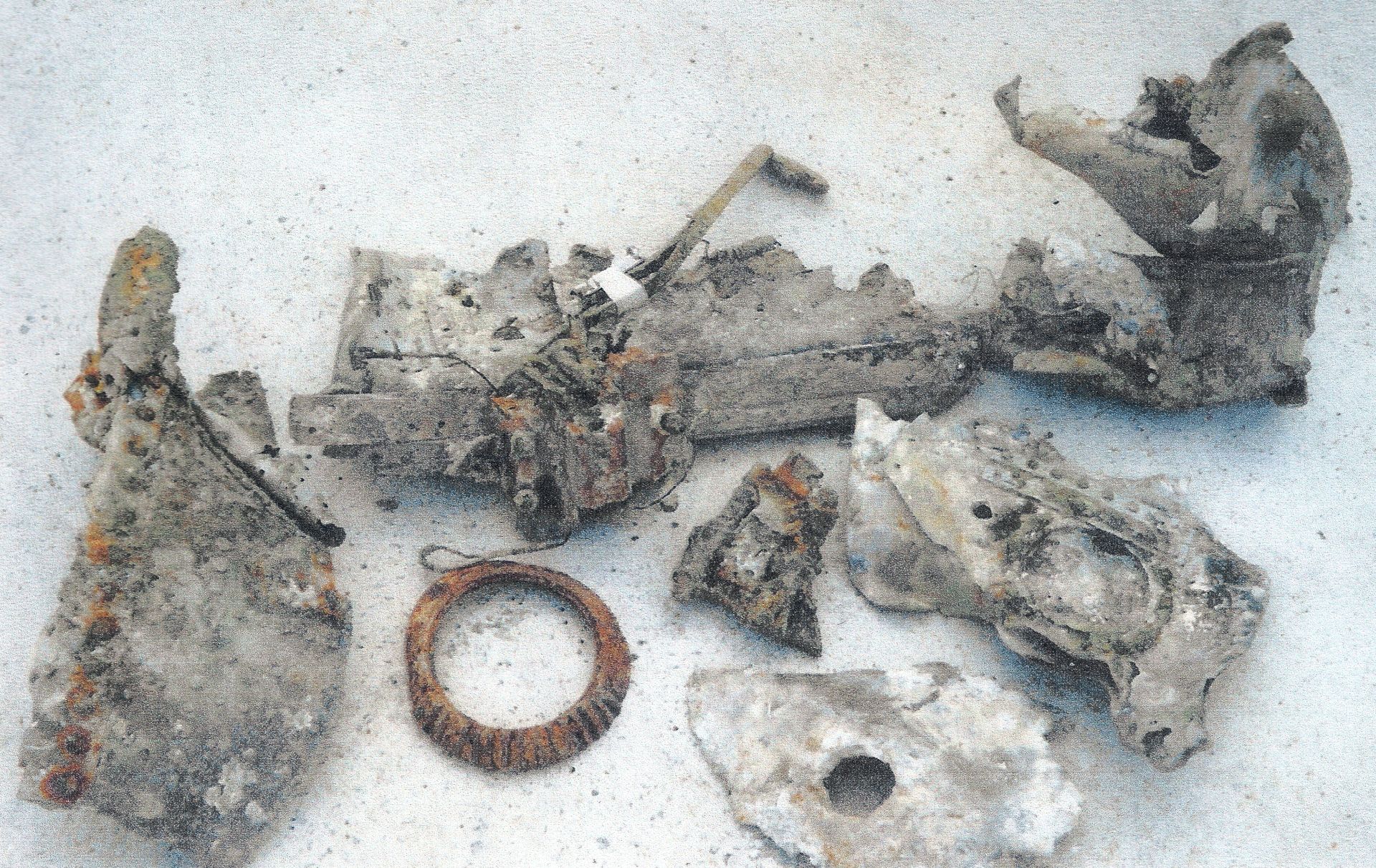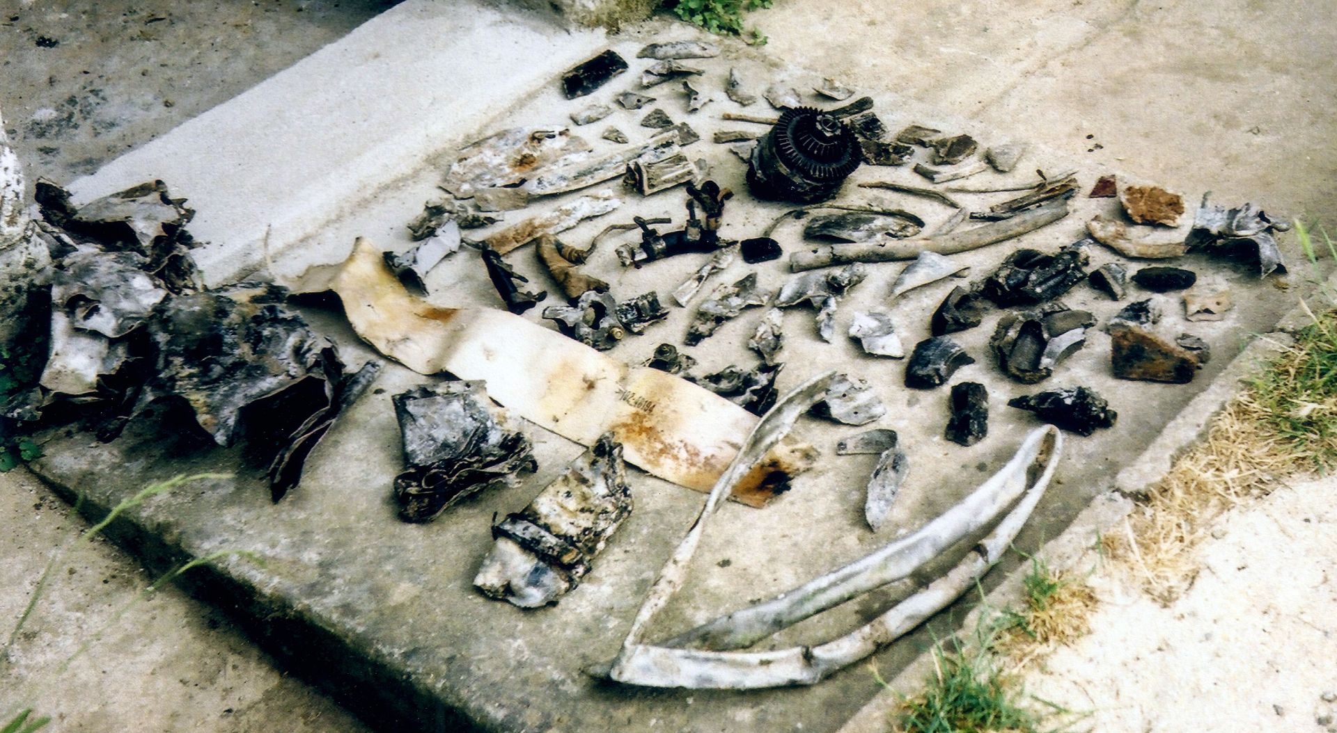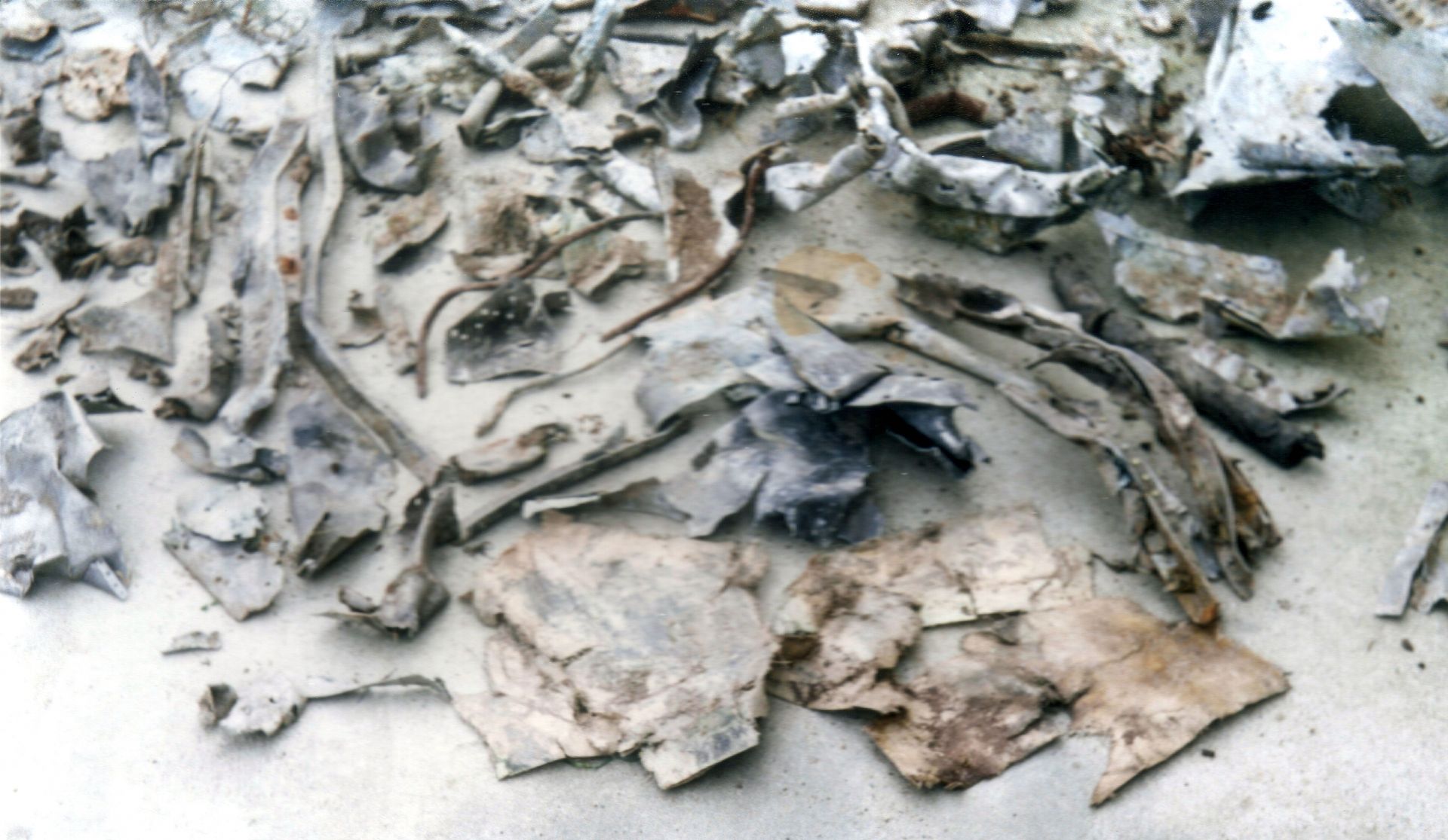 Numerous small metal pieces suggest a violent impact during the plane's crash.